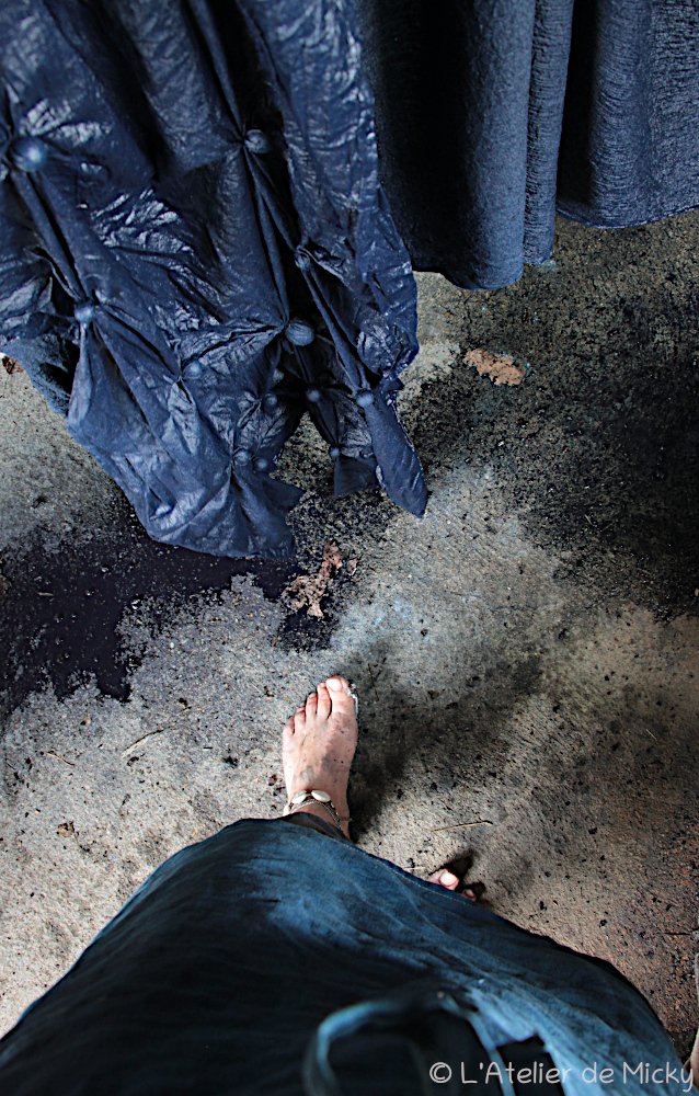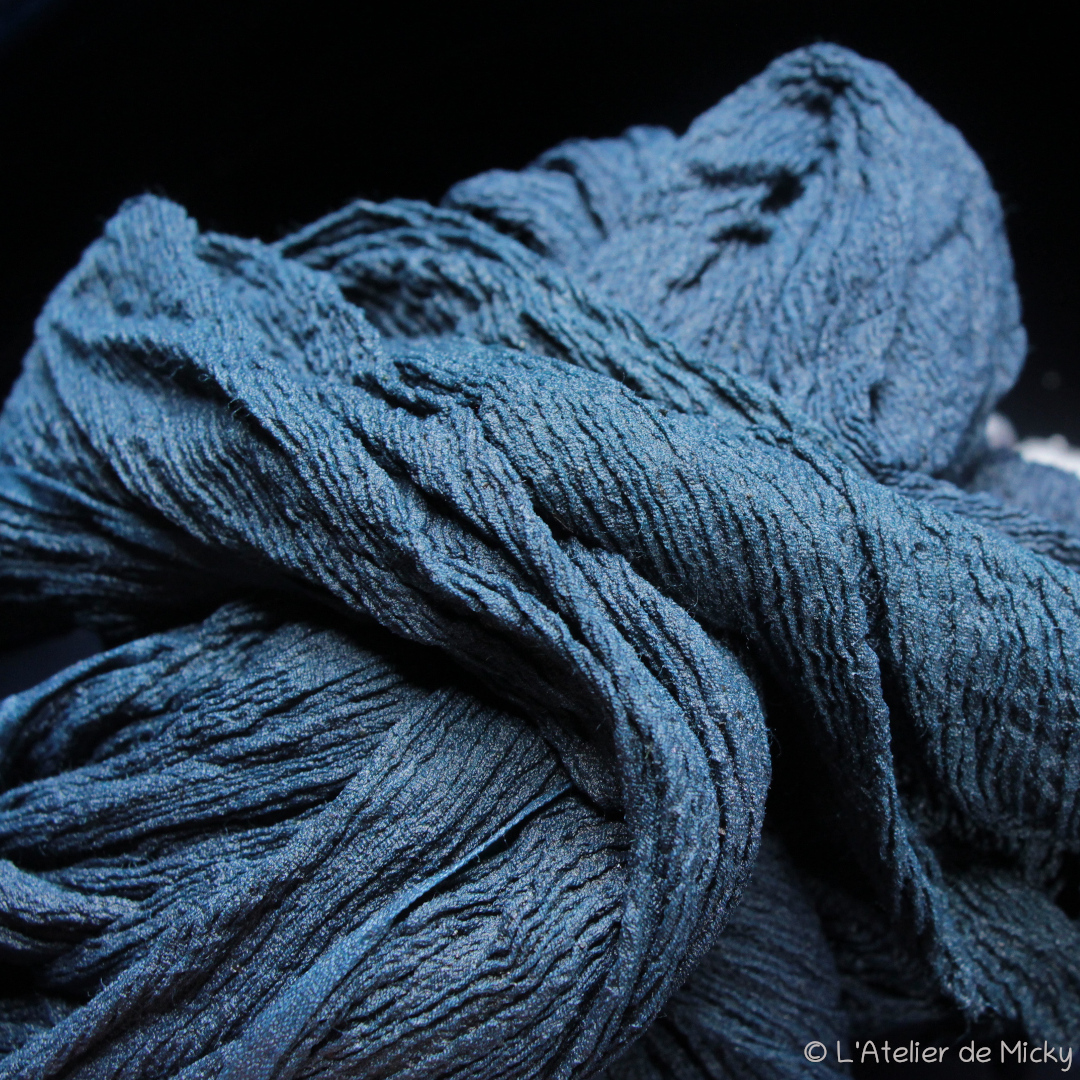 I also dye scarves and a few fabrics for which I have 2-3 things in mind. Organic crinkled cotton, recycled cotton, wild silk or wool: each material and piece has to be dyed a little differently, with varying dipping times in the vat and a minimum number of dips that can vary. Generally speaking, the minimum is 10 dips to ensure good colourfastness. Let’s just say that this dyeing aren’t very quick, but I love doing them! They’re important, even vital, for my mental balance!