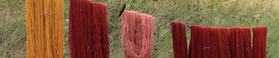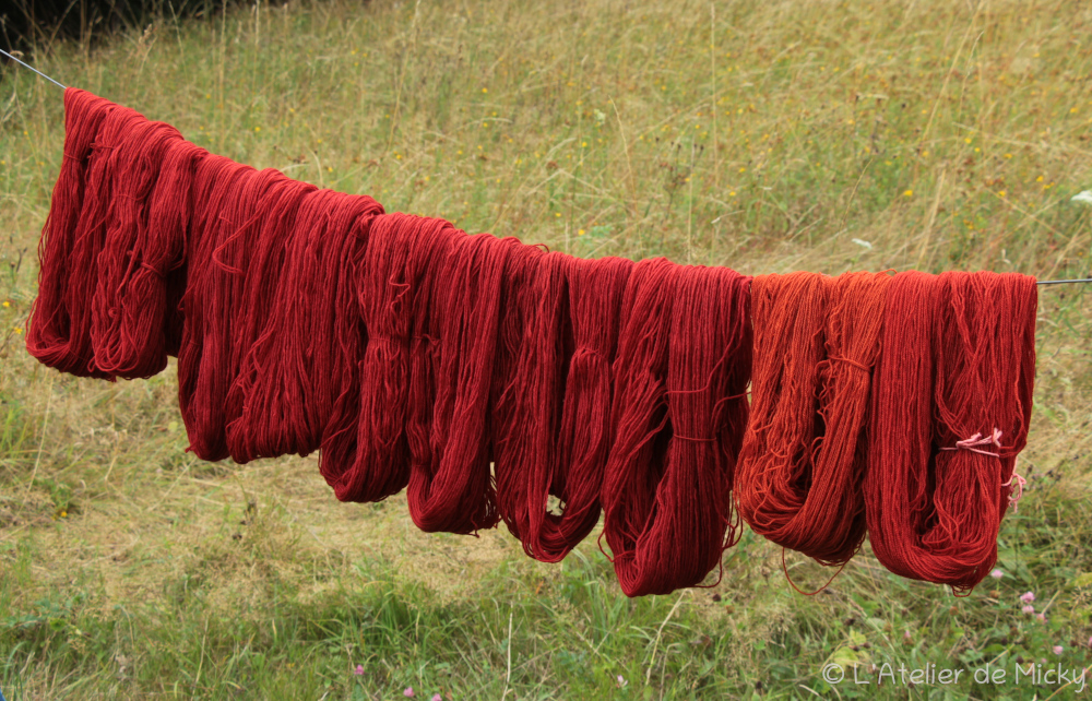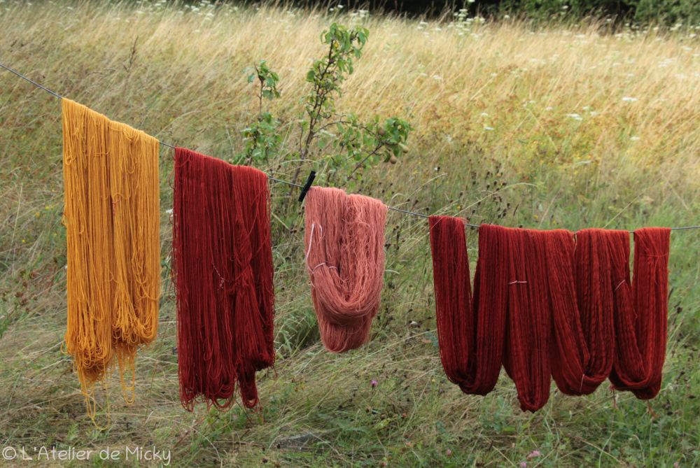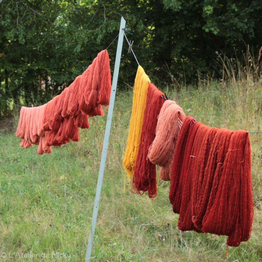 Je suis passée des nuances de cochenille aux rouges, oranges et jaunes avec la racine de garance et la gaude (et un peu de feuilles de bouleau et de tanaisie). J’ai loin d’avoir fini d’ailleurs…