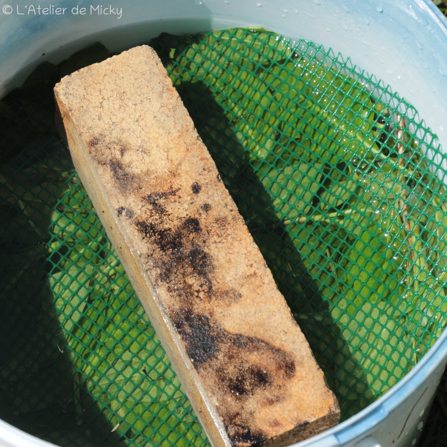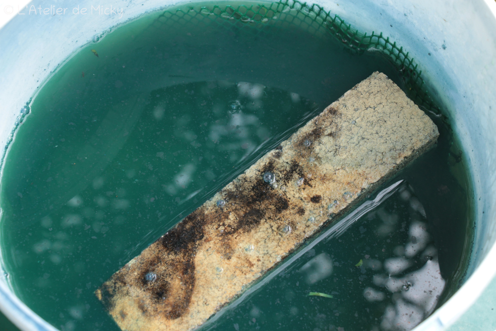 Les feuilles ou les rameaux sont immergés dans de l’eau (de pluie de préférence) et on ajoute un lest pour qu’elles restent immergées complètement. Ensuite, il faut attendre, cela dépend de la température extérieure. Moi j’ai mis mon seau dans la véranda. Certains vont le laisser au soleil (mais il faut alors bien surveiller les signes de fermentation, qui peut vite dégénérer en bouillie puante si l’on ne contrôle pas régulièrement…)