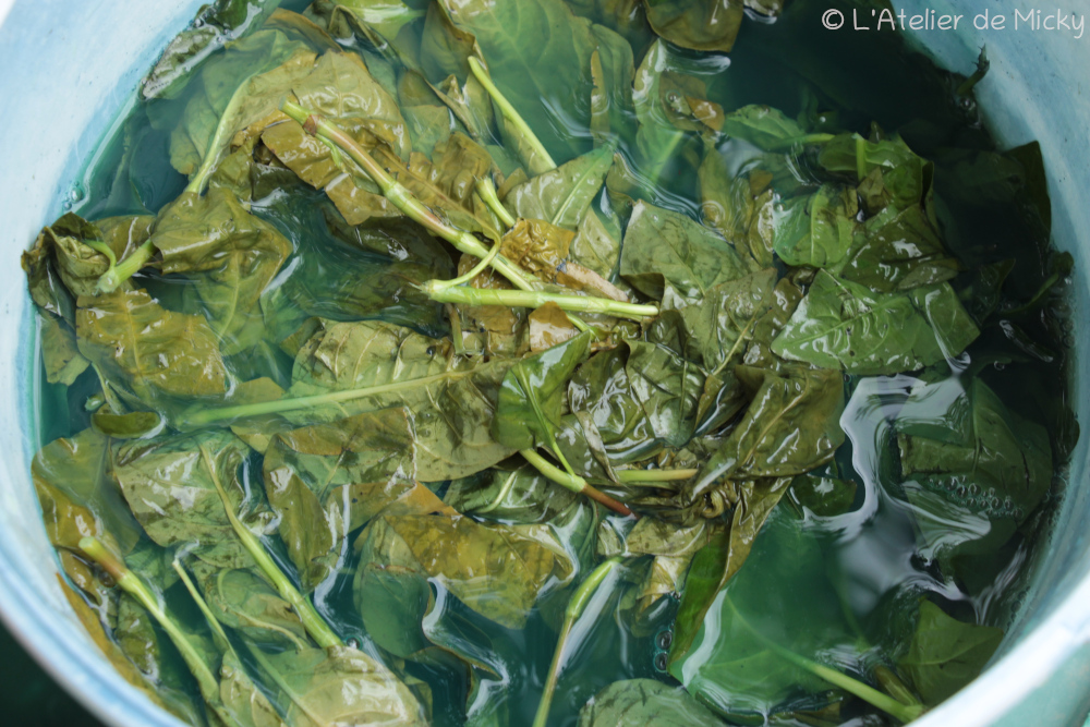 J’ai choisi d’utiliser seulement les feuilles, qui contiennent beaucoup plus de pigment que les tiges, mais on peut les laisser.