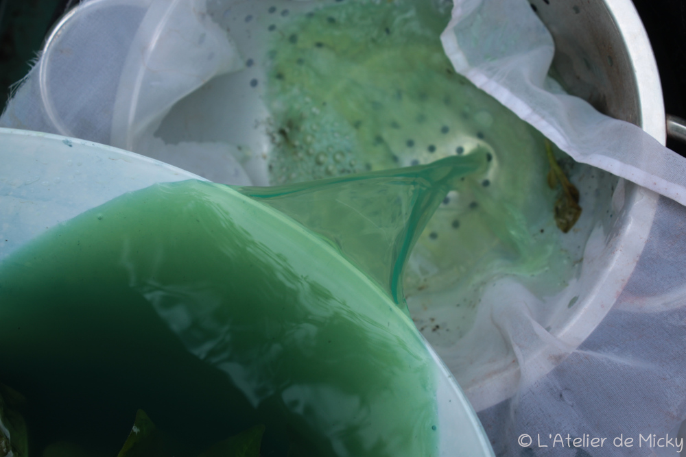 Les feuilles sont retirées du bain, pressées et mises au compost. Le liquide est filtré dans une mousseline fine pour éliminer les résidus de plantes. Couleur de lagon tropical assez magique je trouve!