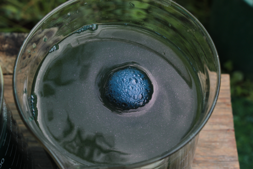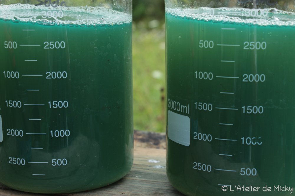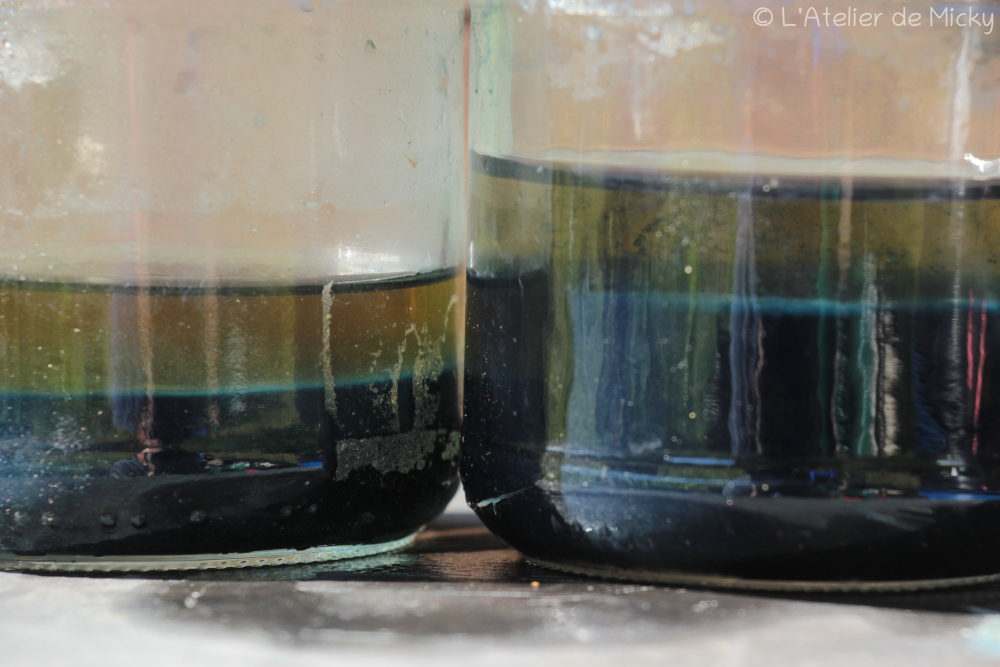 Pour ce premier essai, j’ai divisé mon liquide d’extraction en deux parties pour tester deux procédures différents. Pour dimériser l’indoxyle, il faut une oxygénation et un milieu alcalin. Pour le pastel, j’ai toujours utilisé les cristaux de soude avec de bons résultats, même si la décantation prend un certain temps. depuis, j’ai appris que l’usage de chaux éteinte permettait de faciliter la floculation et d’ailleurs beaucoup de producteurs d’indigo de persicaire l’utilisent seule pour produire leur pigment. Comme j’aimerais obtenir un pigment sans trop de résidus de chaux, j’ai testé la soude seule (avec seulement une pincée de chaux) et la chaux seule.
