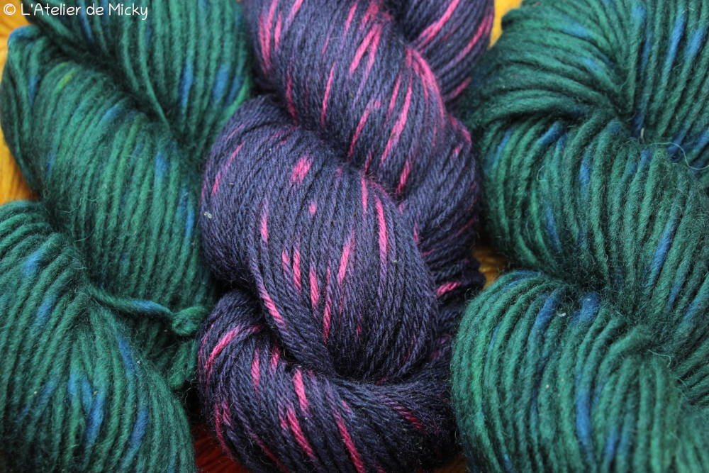 As my tie-dye skeins always find new homes, I did a few more than usual, on French wool and some merino and silk blends. These deys are quite time-consuming, but I like the result!