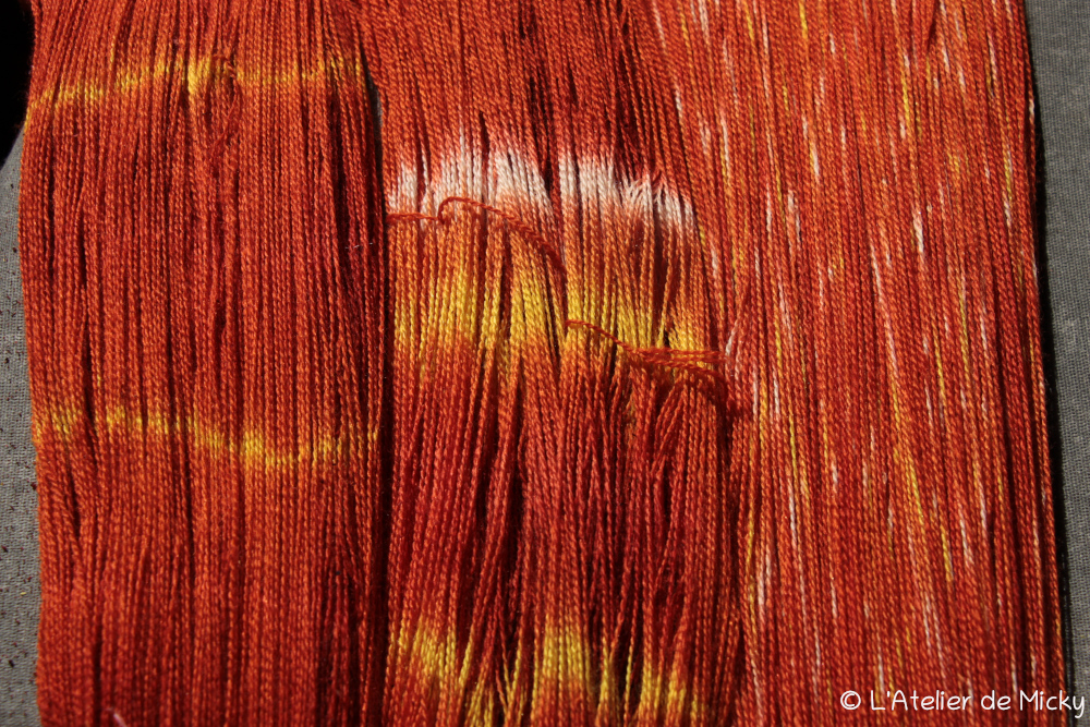 Je ne suis pas entièrement satisfaite du rouge, mais j’ai un peu travaillé sur le mordançage. Le lin ne se mordance absolument pas comme les fibres animales… Pour ce rouge, le mordançage se fait en trois étapes avec de l’alun et des galles.