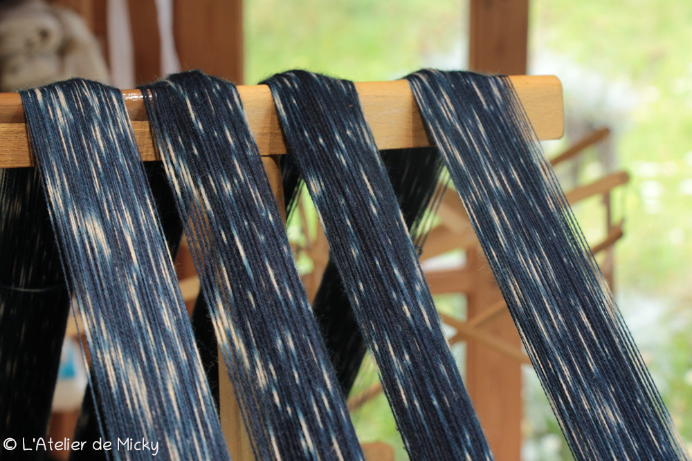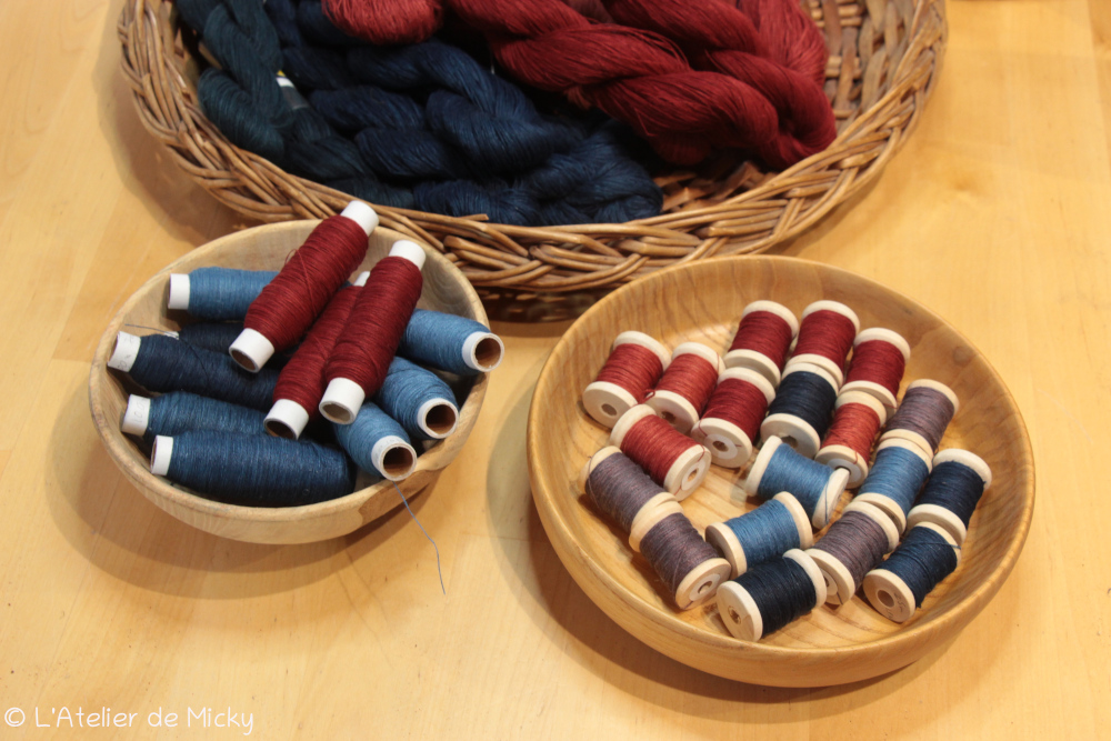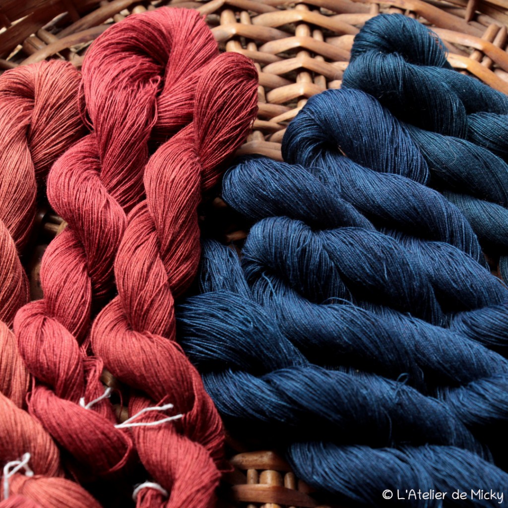 J’avoue que j’ai vraiment hâte d’être fin novembre et de pouvoir enfin m’arrêter un peu et me consacrer à des projets personnels! Je n’ai pas touché mon enthousiasmant tissage d’Arlon depuis le mois de mai! Par contre, j’ai teinté une série de fils de lin très fins à l’indigo et à la garance, le fil que j’utilise pour Arlon…