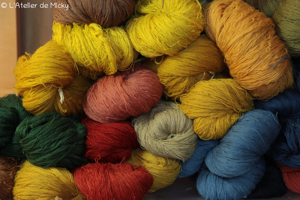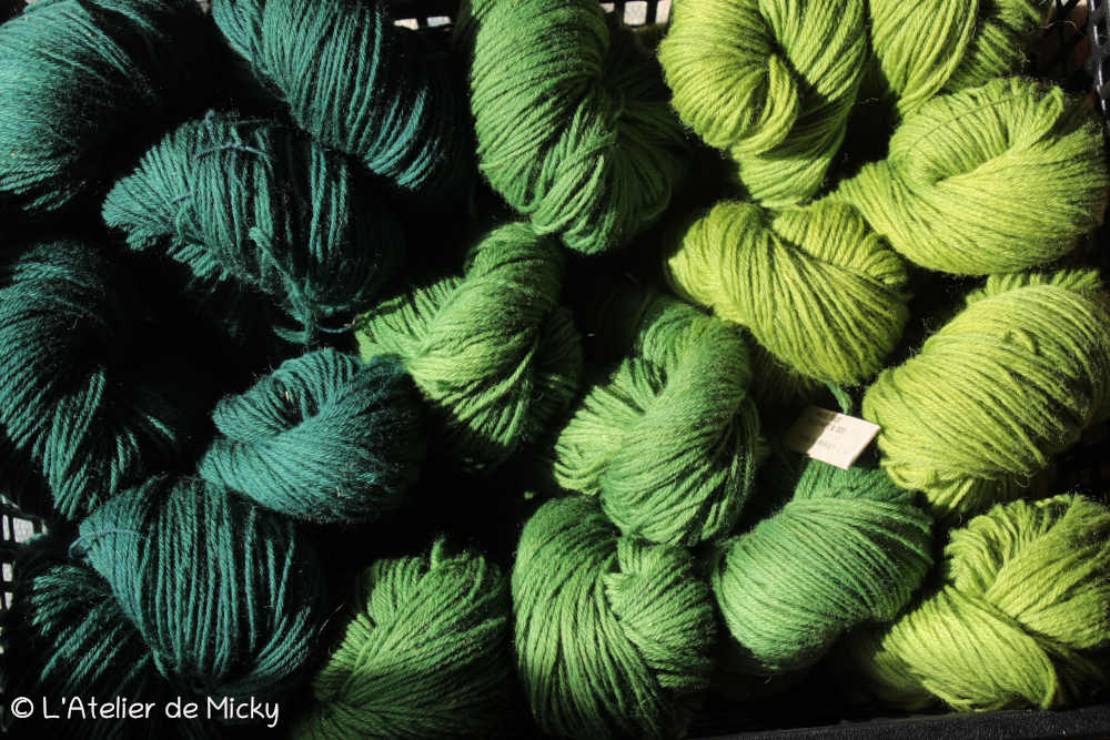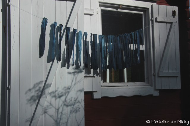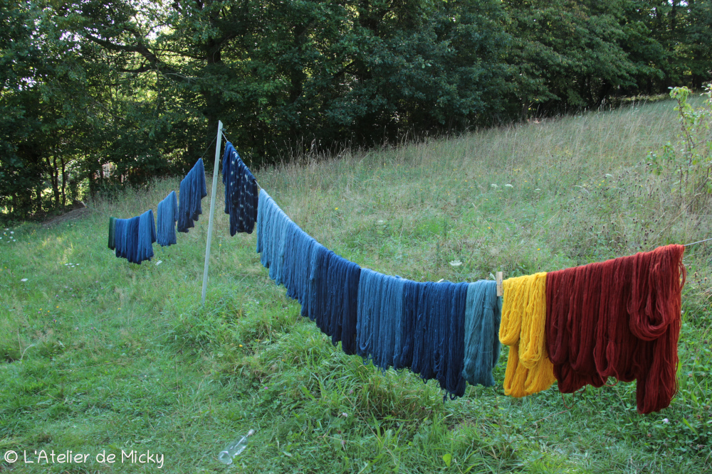 Les laines en différentes nuances de bleu indigo ont été teintées en août et je n’ai pas encore fini de les teindre en jaune pour des verts, c’est vous dire si je suis en retard!