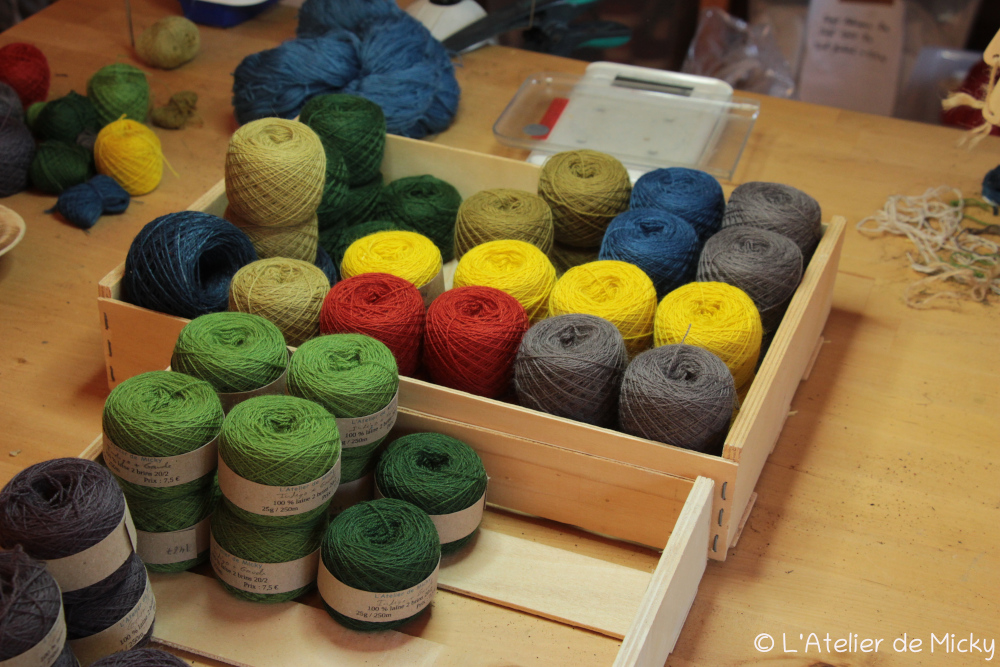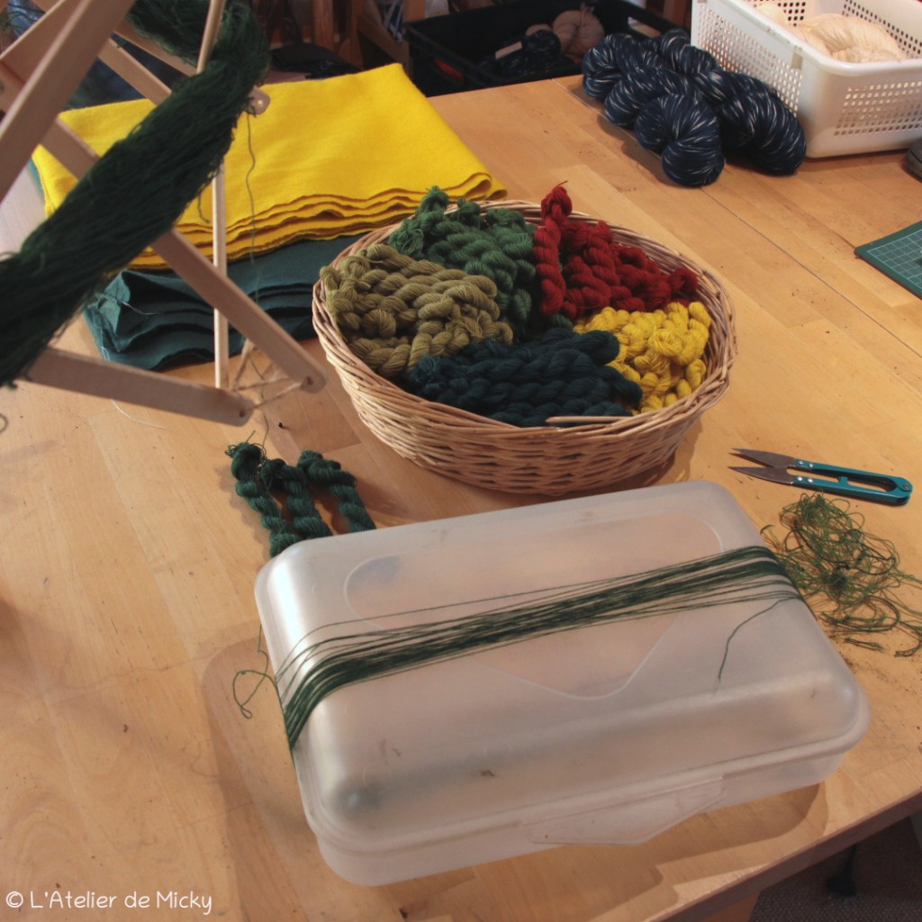 Quand les écheveaux teintés s’accumulent dans l’atelier, il est temps de faire des pelotes, heureusement mon conjoint me donne un coup de main pour ça parce que ça prends beaucoup de temps également.