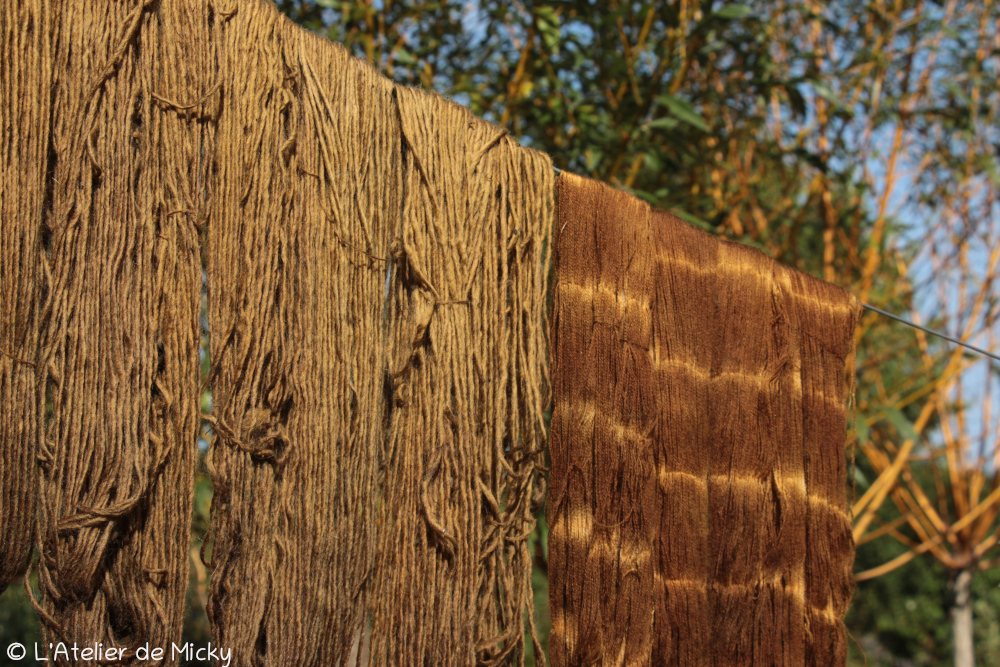 Voilà un écheveau de mérinos et soie teinté avec de la garance et de la gaude: à gauche l’écheveau sec après teintures et à droite après remise en écheveau pour mettre en valeur l’aspect chiné du résultat final.