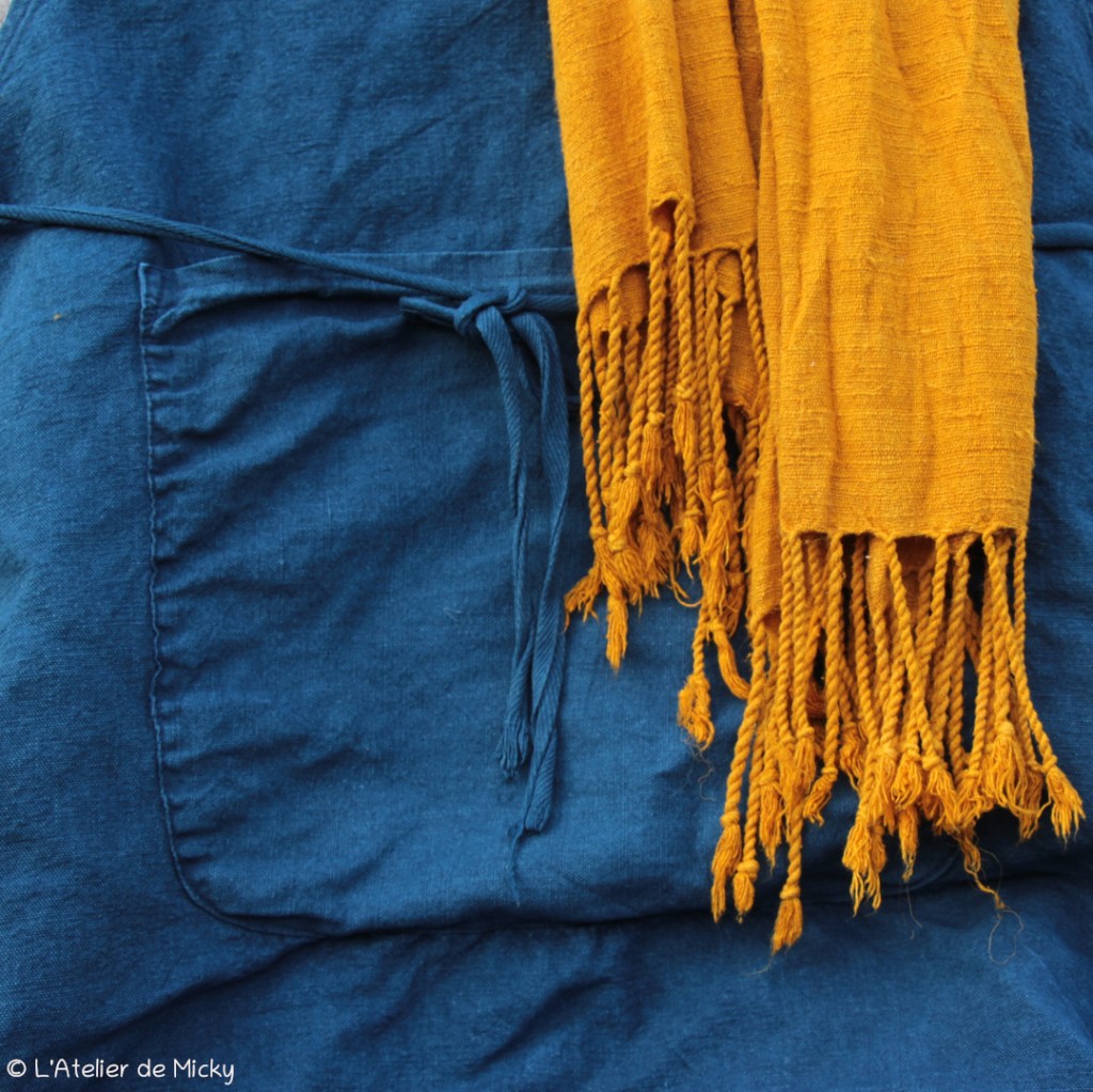 J’ai même réussi à travailler un peu pour moi avec la teinture d’un joli tablier ancien à l’indigo (et une écharpe en soie sauvage teintée au curcuma, une couleur magnifique mais fragile au soleil, qui me tiendra chaud cet hiver avec une teinte énergisante!)