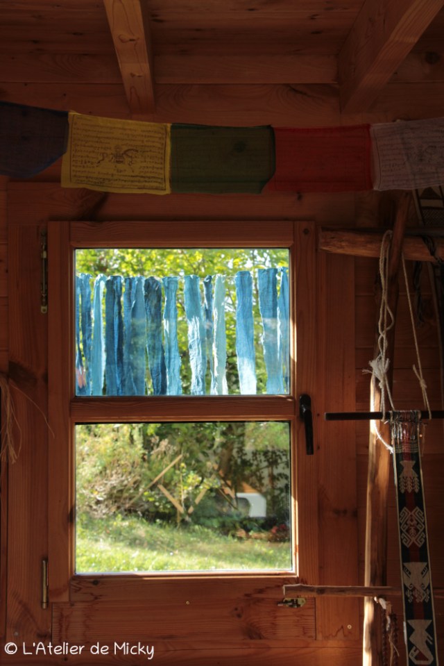 Le mordançage a été fait en septembre. Je fais généralement le bleu d’abord, car j’aime bien l’avoir dans l’œil pour savoir vers quel vert je vais aller lors de la teinture à la gaude sur le bleu. Cette année, la gaude est de très mauvaise qualité chez mes fournisseurs habituels, ça a été difficile de faire des verts corrects, aussi lumineux que je les aime…