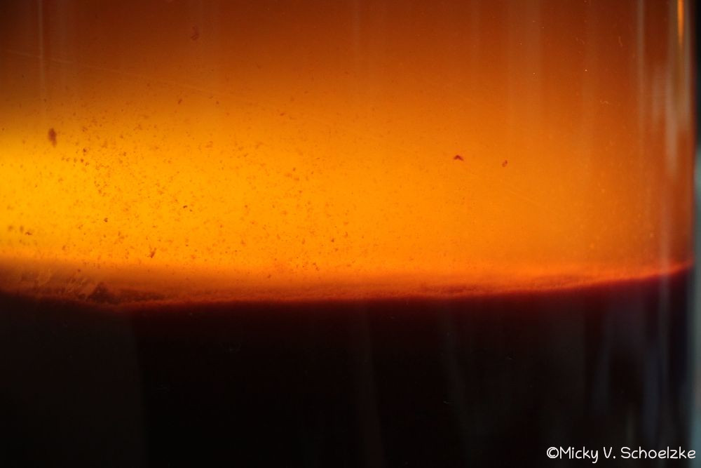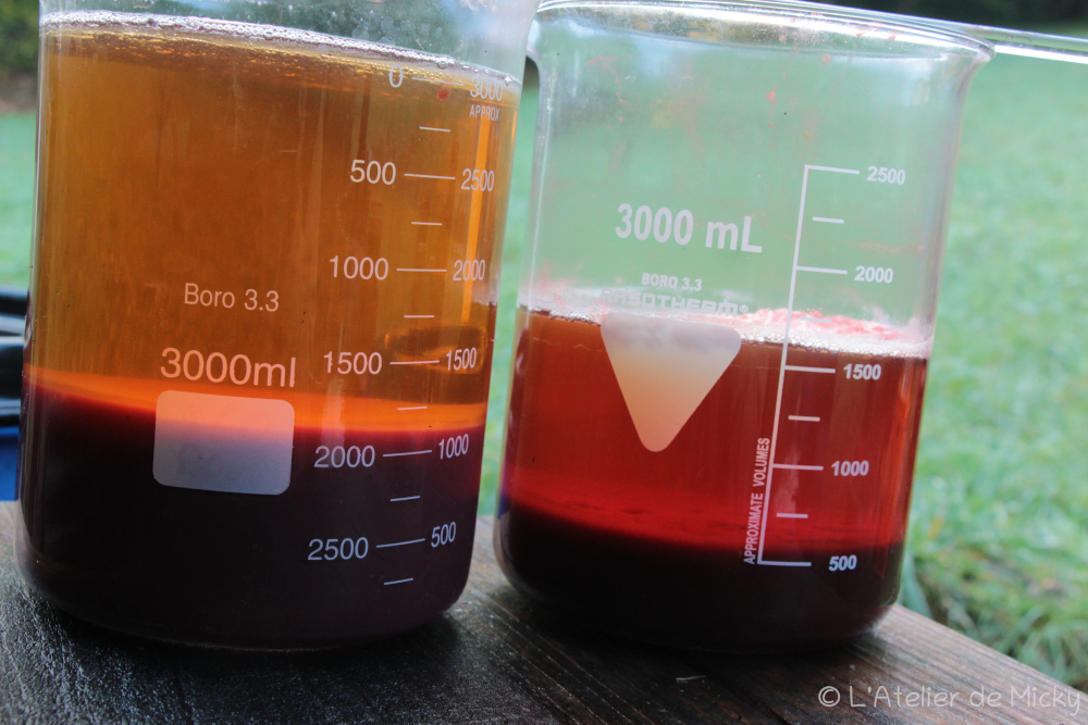 Laissez décanter une journée entière, le liquide au-dessus du précipité devrait être clair, sinon on peut ajouter un peu d’alun puis un peu de soude et répéter le processus. La recette est à adapter en fonction des colorants encore présents en solution. J’ai testé la potasse (carbonate de potassium) en remplacement de la soude, ça marche également. Certaines recettes utilisent de la chaux.