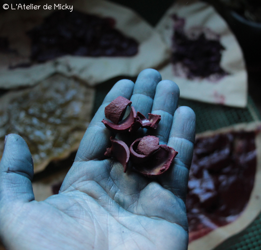 After drying, you can finely grind your pigments in a mortar (as usual, it’s best to use a mortar reserved for this purpose and not something you’re going to reuse in the kitchen…). There are also some special tools called glass mullers, that you use on a glass or marble surface. Here’s a nice cochineal pigment (top) and a madder pigment (bottom).