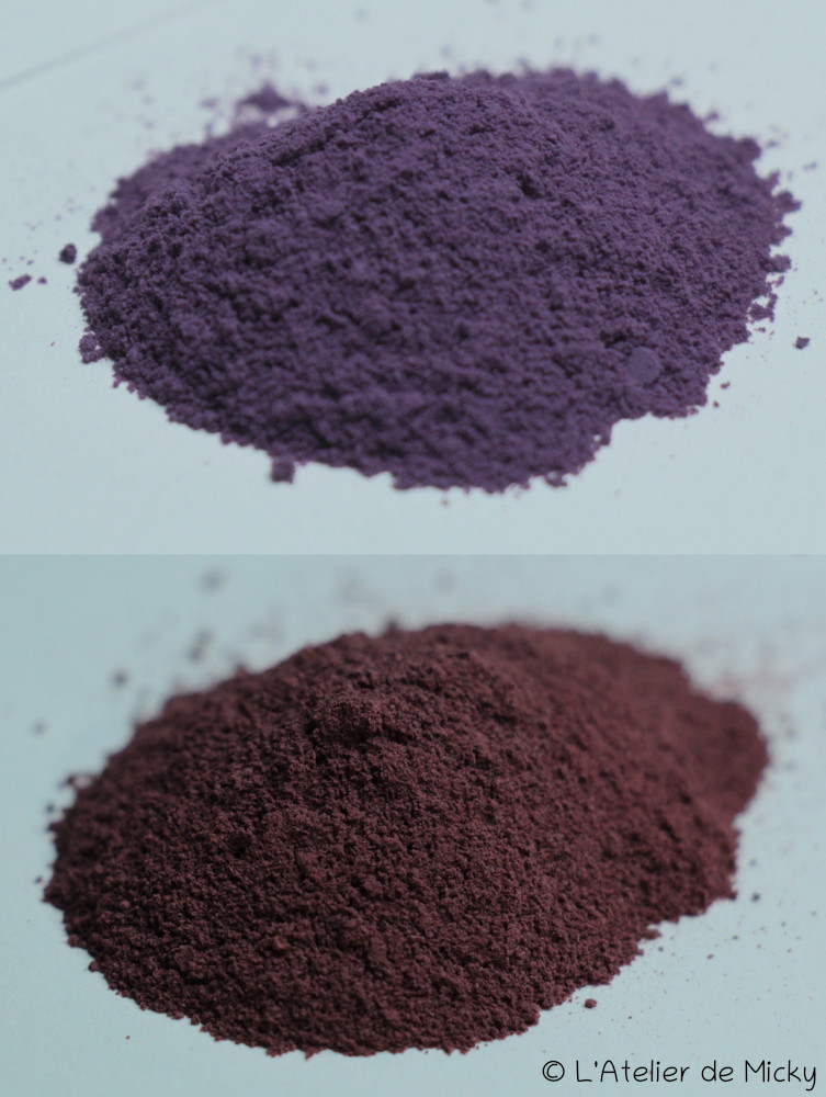 Après séchage, vous pouvez broyer finement vos pigments dans un mortier (comme d’habitude, mieux vaut utiliser un mortier réservé à cet usage et pas quelque chose que vous allez réutilisez en cuisine…). Il existe également des outils spécialisés en verre appelées molettes à broyer, qu’on utilise sur une plaque en verre ou en marbre. Voici un beau pigment de cochenille (en haut) et un pigment de garance (en bas).