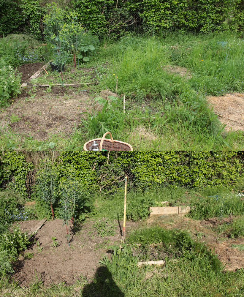 This is what part of my dye plant patch looked like before and after a few hours’ work… I always leave spots of nettles, white dead-nettle, St John’s wort and a few other early flowers that pollinators love (dandelion, for example), but all these little creatures quickly take root, reseed, spread out and take up space!