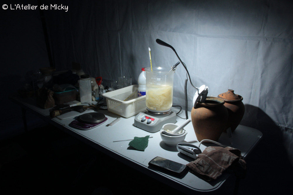 Dès le vendredi soir, j’avais installé mon petit « laboratoire de campagne » sous un barnum pour procéder aux derniers mordançages en conditions contrôlées.