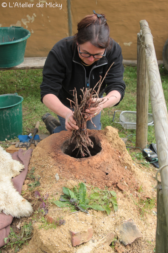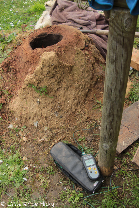 J’avais demandé à la potière de me prêter sa sonde de température, bien pratique pour savoir où on en est… Mon but était de monter entre 150 et 200°C. Ce qui aurait été parfait, c’est de pouvoir vraiment chauffer fort les parois du four, mais ce n’était pas possible.
