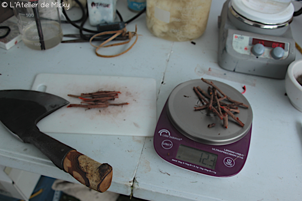 During the harvest, I was taken aback by some roots that looked just like madder but were very white inside! After checking, they turned out to be those of soapwort, which grows in the same patch! I knew the plant, but not the root in-situ, because it never wanted to grow at my place… It’s amazing how similar they are, and I had to be careful all weekend not to pick up the soapwort by mistake! Some pieces ended up in a beaker at one stage and I had to weigh my sample again.
