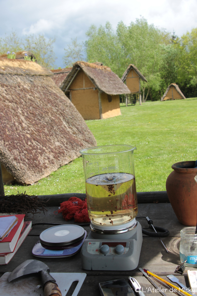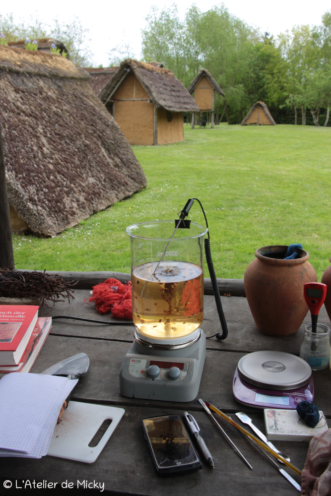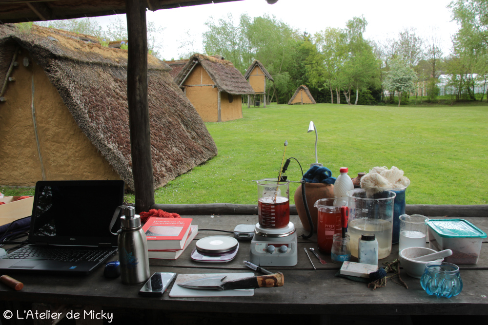 Pendant le dernier week-end d’avril, je suis retournée à Marle, au Musée des Temps Barbares où j’ai mes habitudes, pour un projet particulier lié à mes recherches sur la pourpre d’imitation avec garance et pastel, selon l’une des recettes du Papyrus holmiensis. J’en avais déjà parlé dans cet article et son PDF lié.