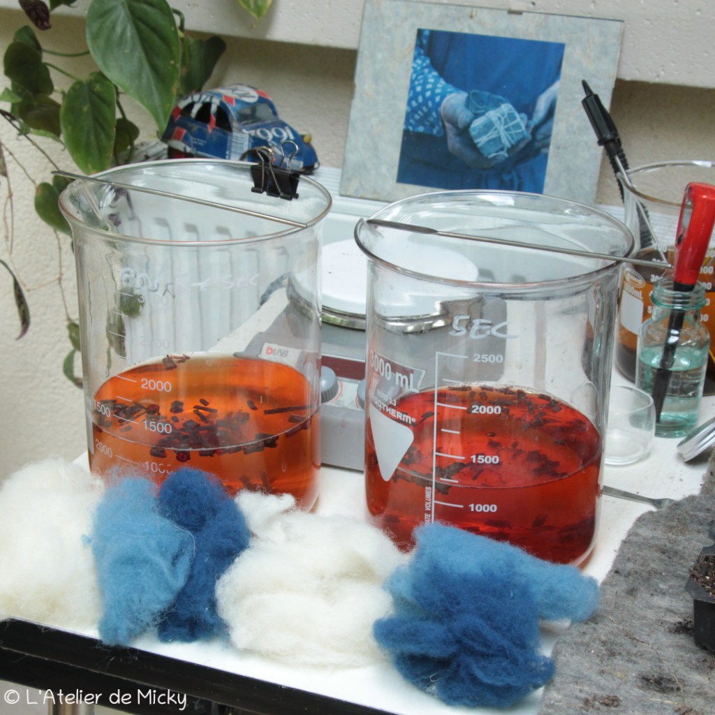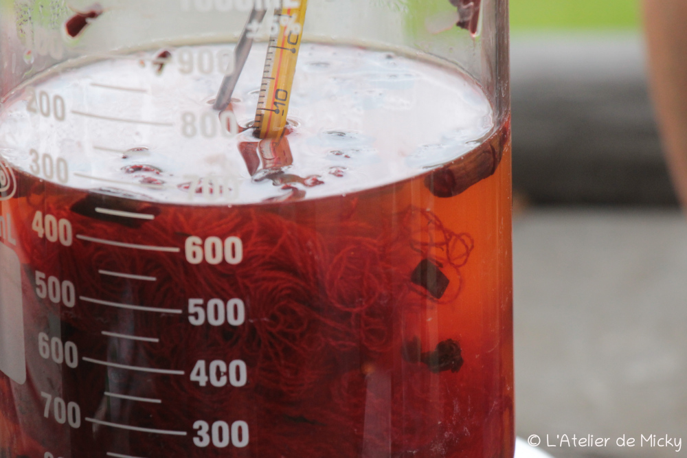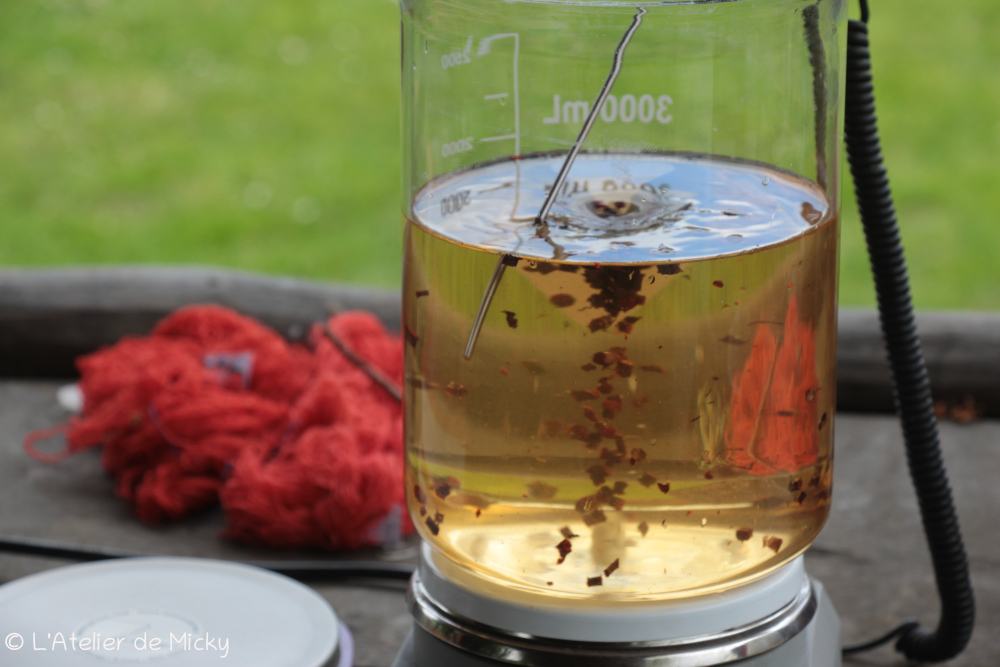 On me demande parfois « alors, tu as réussi? » mais ce n’est pas tant réussir qui compte dans ce projet, mais comprendre la façon de travailler des teinturiers antiques qui imitaient la pourpre, pratique qui semble répandue dans le monde antique. Et pour le moment, je m’attache surtout à comprendre comment les procédés mis en oeuvre avant de teindre, à partir de la récolte des rhizomes de garance, peuvent influencer le résultat final en terme de nuance de rouge. Et il semble que j’ai mis le doigt dans un engrenage passionnant! Je ne suis pas la seule à tester ce genre de procédés et l’échange avec d’autres apporte plein d’informations, mais lire les travaux et voir les résultats des autres n’est pas suffisant pour comprendre. La teinture repose sur un faisceau large de savoir-faire et d’expériences des sens qu’on ne peut bien appréhender qu’en mettant les mains dedans…