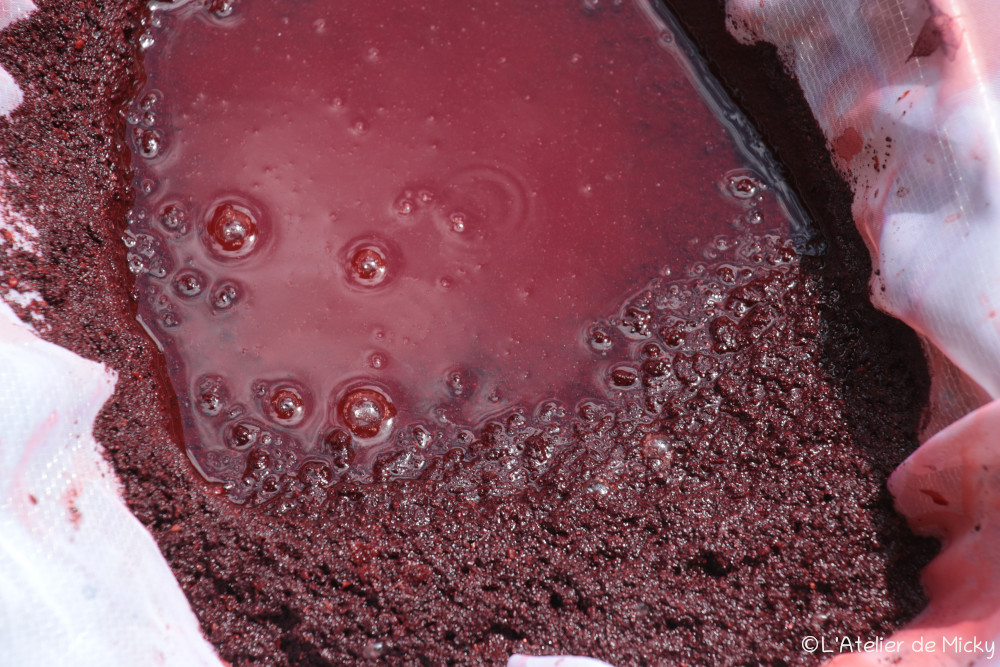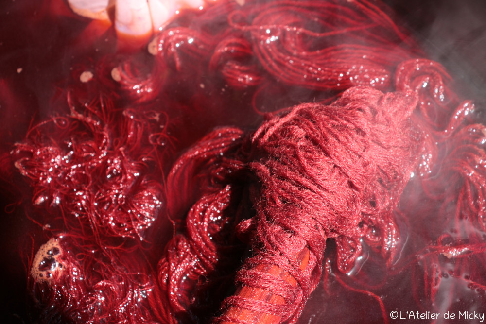 One of the particularities of cochineal is that it does not reveal its final result until the temperature has risen, generally to around 80°C (when little bubbles regularly rise from the bottom of the cauldron). This is what the future burgundy looks like at around 40°C, a pale, slightly pinkish red. Patience, it’s coming…