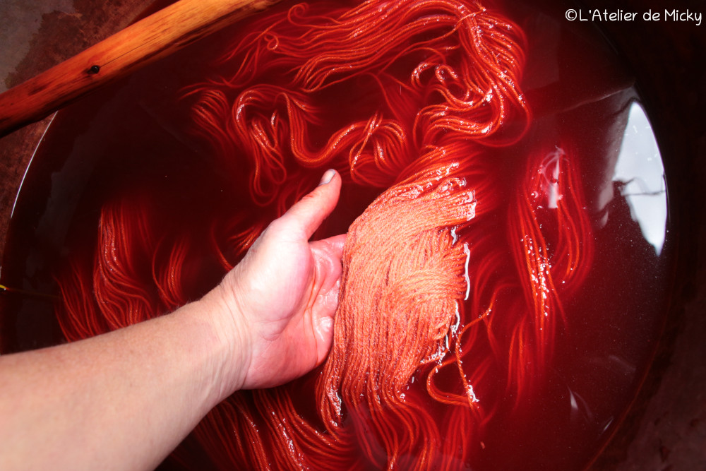 Il y a un ingrédient important pour un beau bordeaux, c’est la crème de tartre ou bitartrate de potassium, qui est un sous-produit de la vinification où il se forme naturellement dans les tonneaux. On l’ajoute dans les cochenilles préalablement pulvérisées et mises à tremper une nuit avant la teinture à raison de 12% (dans de l’eau de pluie pour ma part, car la cochenille est très sensible à la qualité de l’eau). Voici ce qui arrive quand on l’oublie: en haut un coupon de laine « comme il faut » avec 28% de cochenille et en bas un coupon pour lequel j’ai tout simplement oublié d’ajouter le tartre! Une couleur tient à peu de choses et il faut toujours être précis en teintures…