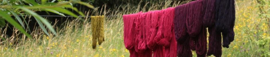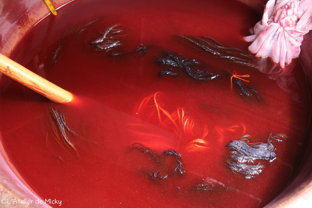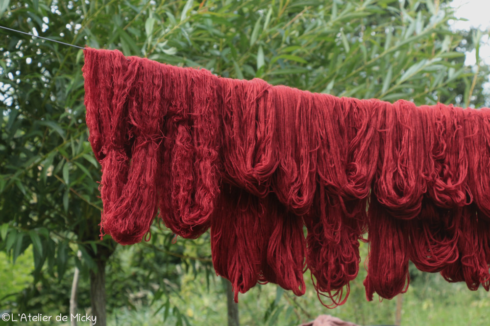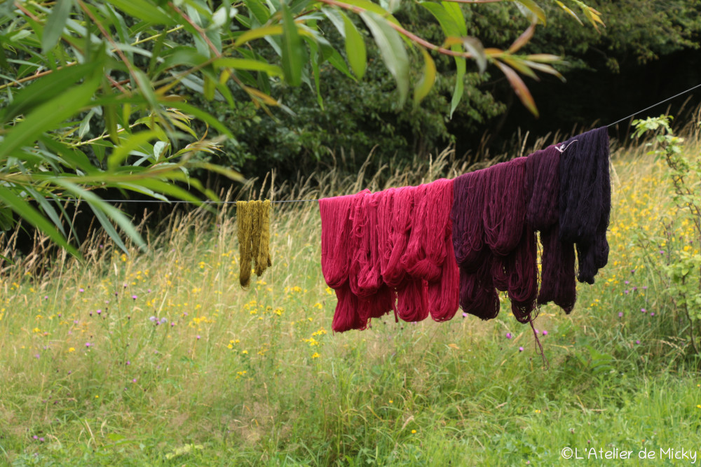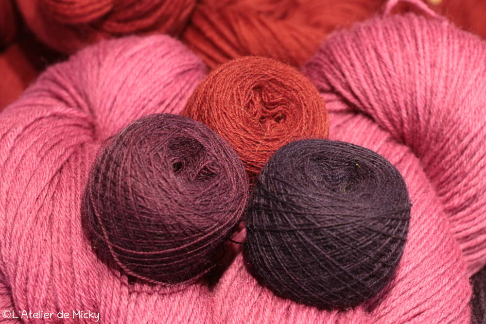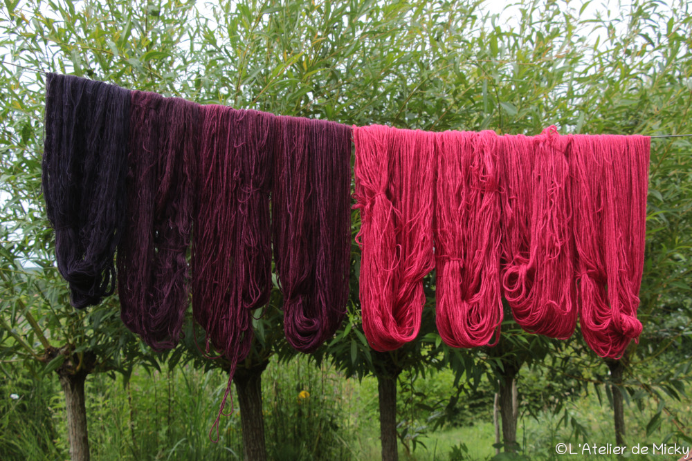 C’est également très beau de sur-teinter des écheveaux teintés à l’indigo avec de la cochenille, les violets sont profonds et lumineux et les possibilités, là encore, vraiment incroyables!