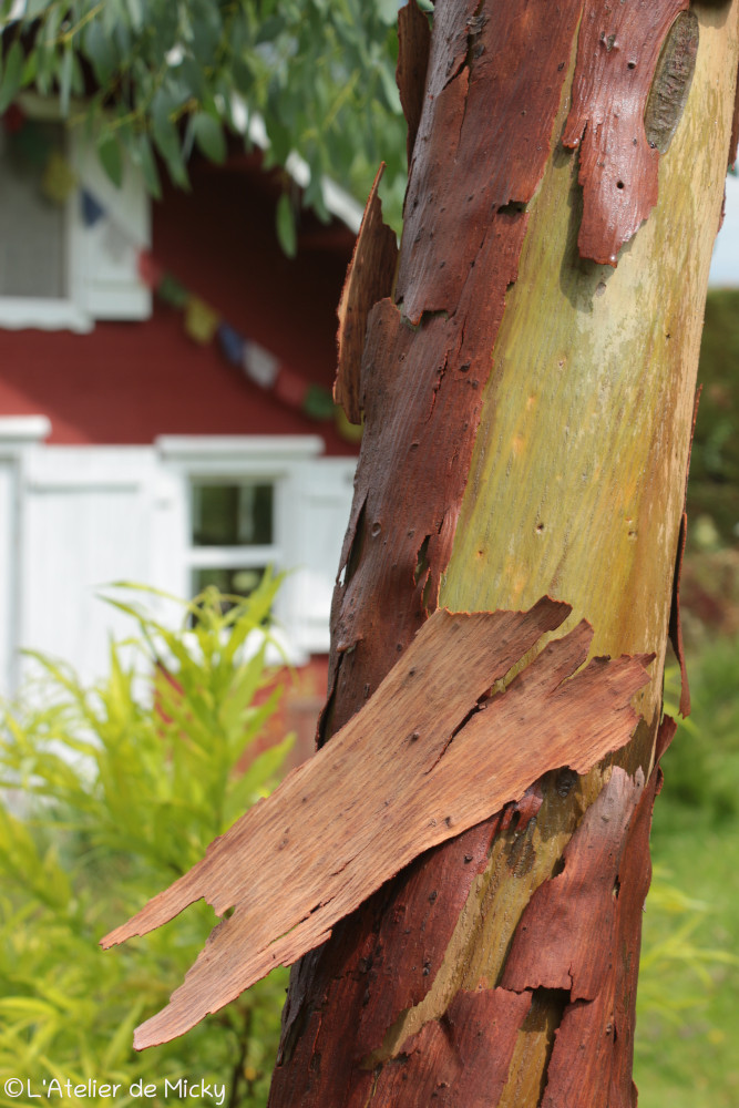 L’eucalyptus en face de l’atelier commence à déquasmer, une particularité de ces arbres. Et après la pluie, ça sent divinement bon!