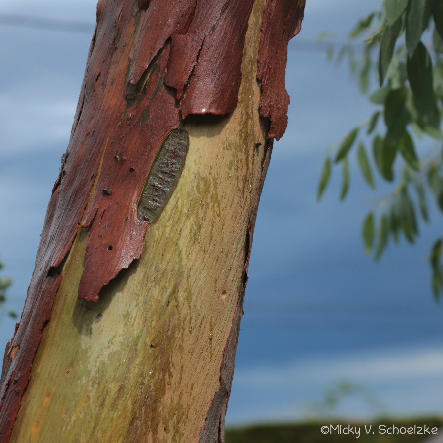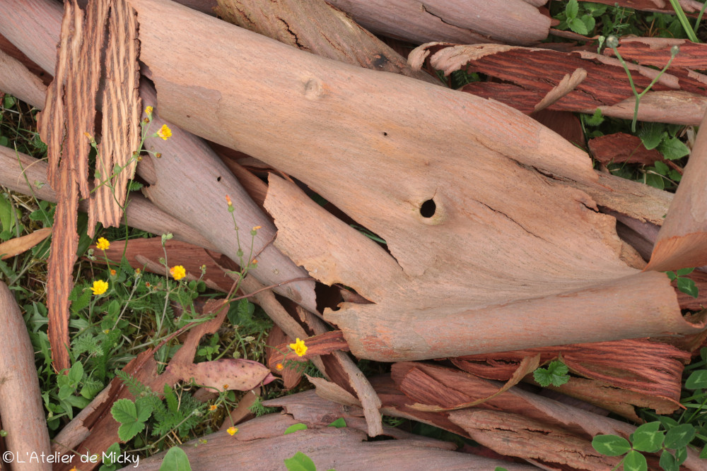 Mon eucalyptus est très beau cette année, c’est un arbre qui, bien qu’adapté aux climats assez arides, apprécie quand il pleut beaucoup! Tous les ans, il desquame, laissant apparaître de magnifiques nuances sous l’écorce qui se détache. L’écorce est une bonne source de teinture, je ne sais pas encore ce que je vais teindre avec, mais j’en ai récupéré pas mal.