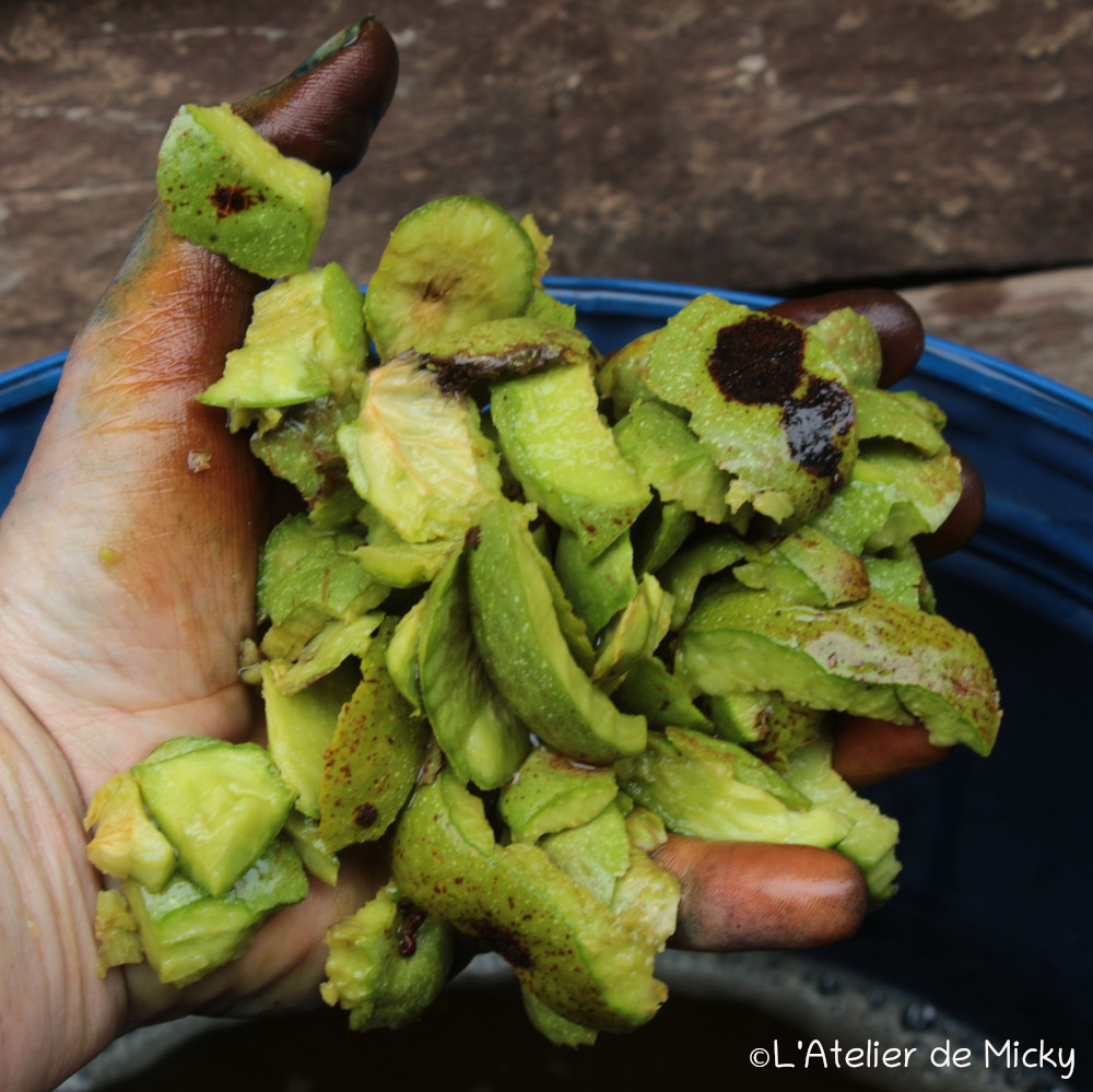 After the nuts have been cut, they are placed directly in rainwater to prevent oxidation, which occurs very rapidly. The dye molecule involved is juglone, present as hydroxyjuglone in the tree (roots, leaves, bark and fruit!), a molecule that oxidizes on contact with oxygen in the air. I always store my macerated green walnuts in closed barrels.