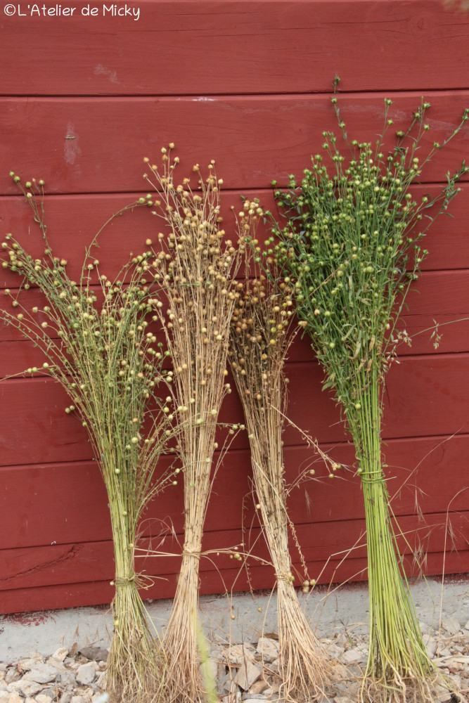 J’ai récolté le lin semé cette année encore. pas une variété textile comme l’année dernière, mais des graines alimentaires périmées récupérées dans l’épicerie associative où je suis bénévole. Les fleurs sont beaucoup plus grosses, et les capsules de graines également. J’avais prévu de cultiver plus grand, mais la parcelle que j’avais préparée est restée vide, là aussi par manque de temps pour m’en occuper.