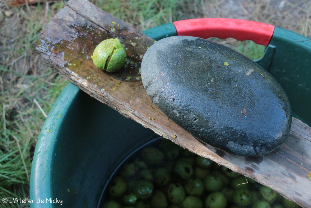 Le problème des noix à ce stade, c’est qu’elles ne sont pas assez mûres pour séparer la partie charnue de la noix en formation et trop mûre pour simplement les couper en deux (possible quand le noyau n’est pas encore sclérifiée, en juin), c’est donc assez laborieux…