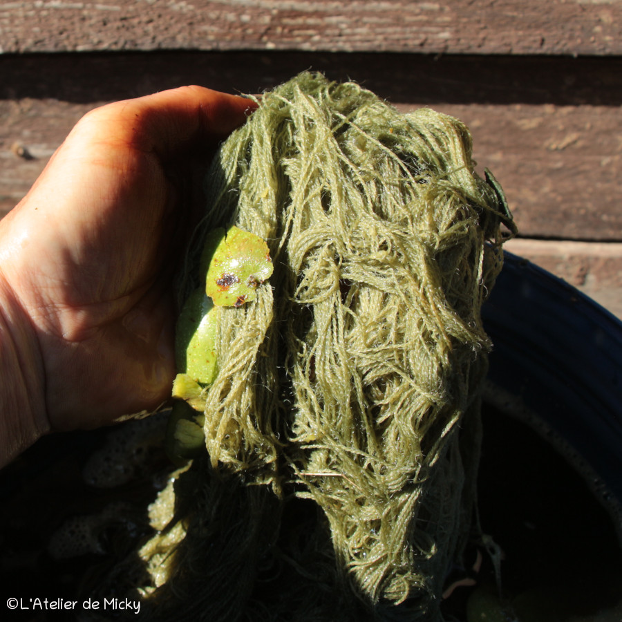 La laine sortie du bain (trempée quelques heures, une nuit, deux jours, plusieurs fois, ça dépend de ce qu’on veut obtenir) n’est pas marron quand on utilise des noix très fraîches mais d’un beau vert kaki! Pas de quoi se réjouir cependant, l’oxydation est inéluctable…