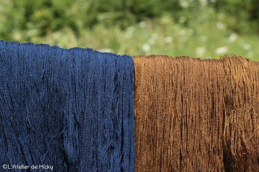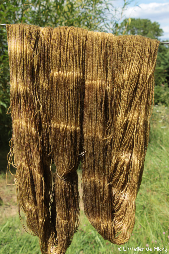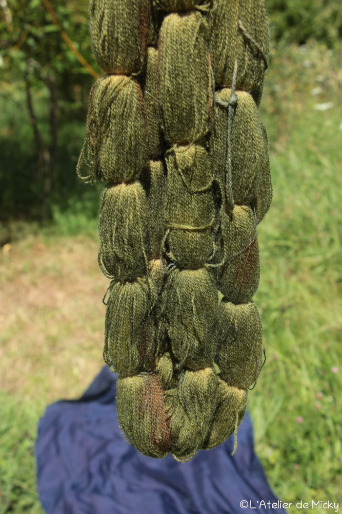 And of course I did a bit of tie-dye on merino wool. Notice the brown areas on the still-green skeins: this is where the skeins have risen to the surface of the container. Fresh macerations « bubble » quite a lot, so to avoid this you can weigh the skeins down with weights, which I omitted in this case…