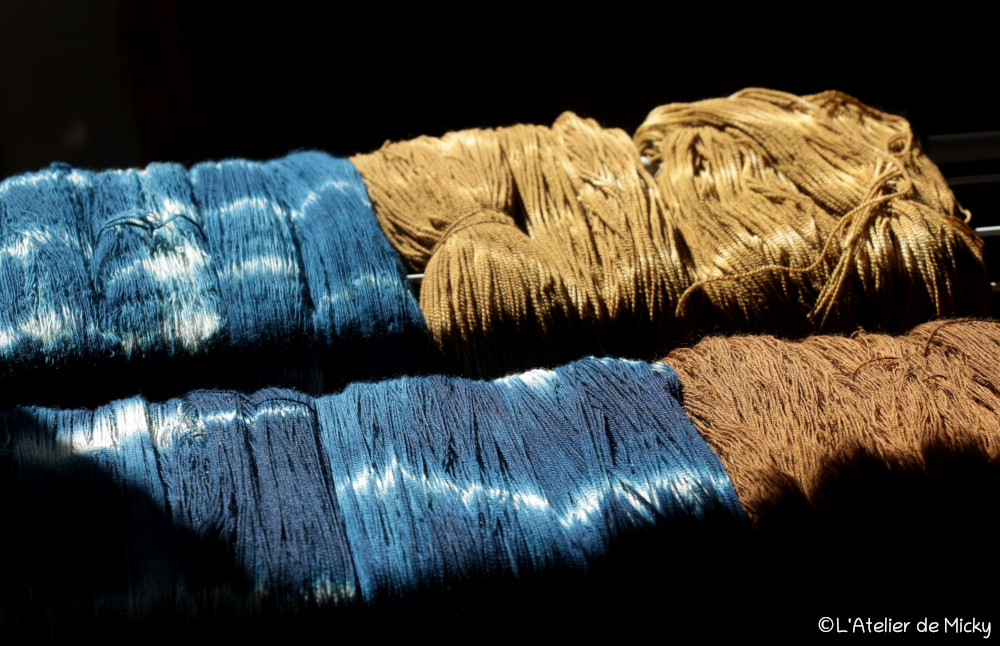 Entre temps, j’ai aussi pas mal teinté avec mes cuves en fermentation, je refais du stock dans les couleurs de laines diverses et je teinte des tissus, je vous montrerai ça, mais il y a beaucoup de photos à travailler!