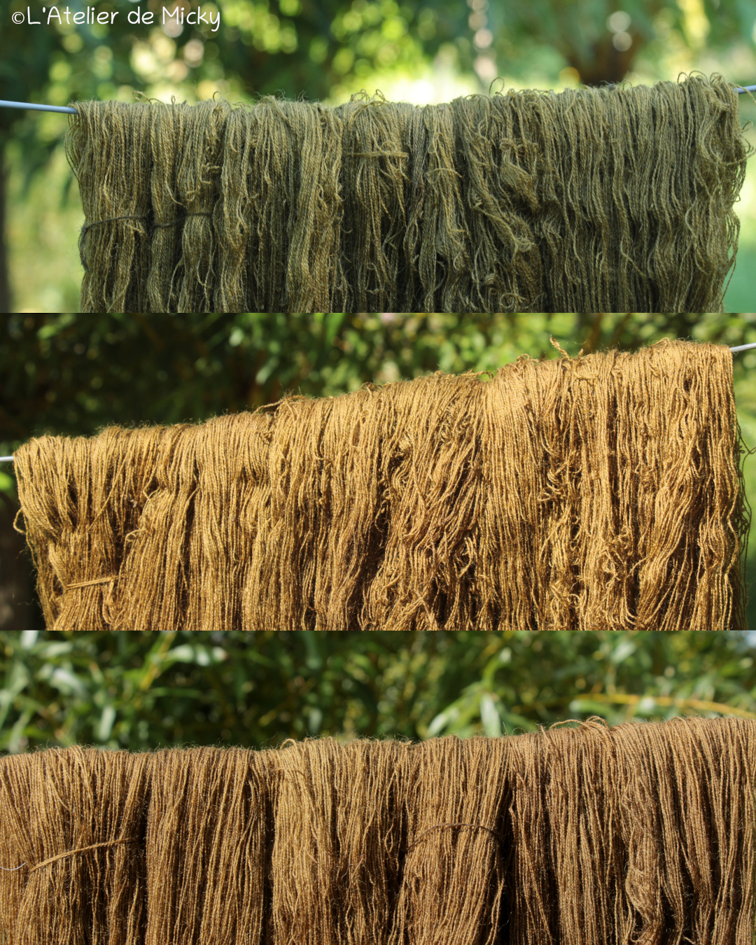 Voici la laine après plus de 24h de trempage, juste sortie du bain en haut, dans l’après-midi au séchage et enfin le soir après rinçage et deuxième séchage. Je laisse toujours la laine sécher une première fois et ce qui est bien avec la teinture aux noix c’est qu’elle ne craint pas trop le soleil… Une fois qu’elle est sèche et bien partie dans l’oxydation, je luis donne un bon rinçage.