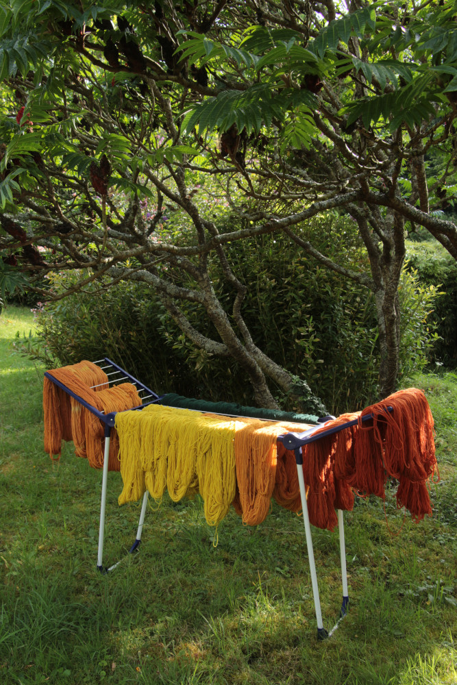 August is drawing to a close and I’m wondering where the summer went! Time has flown by and I’ve done a lot of work while feeling like I’ve made no progress. It’s strange… I haven’t even been able to devote myself to the experiments I’d planned. Dyeing is an extremely time-consuming process, involving the preparation of materials, baths, rinsing, drying and so on. Not to mention the skeining and balling!