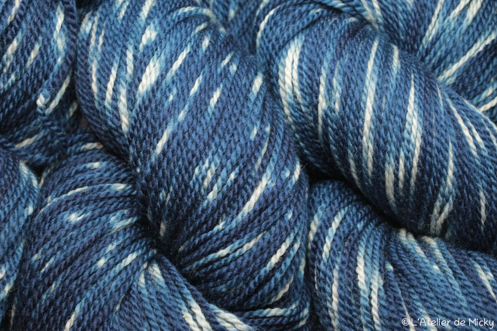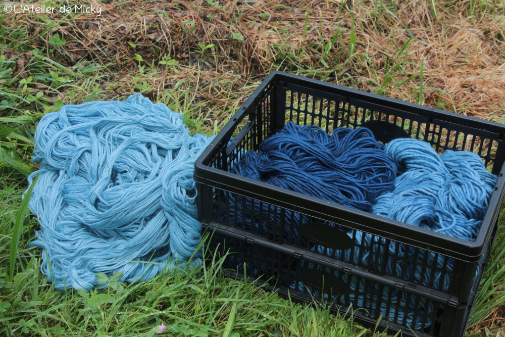 Et teinté et mordancé plein d’écheveaux bleus pour des verts… Il me manquait des bleus clairs et quelques autres nuances dans 4 types de laines, il ne faut pas s’y perdre!