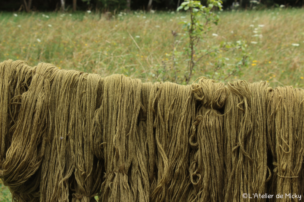 Et j’ai enfin eu le temps de reteinter du kaki (gaude et fer). J’utilise un chaudron particulier pour les mordançages et teintures contenant du fer, pour ne pas risquer de contaminer d’autres teintures.