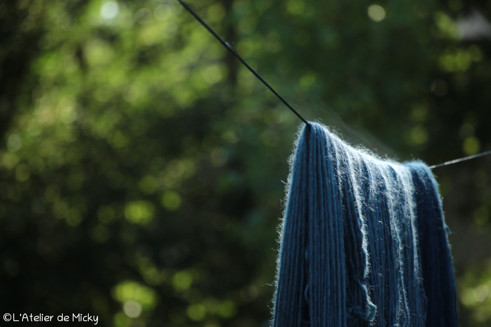 J’ai refait des écheveaux tie and dye dans mes cuves en fermentation.