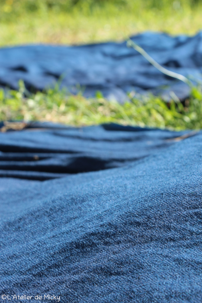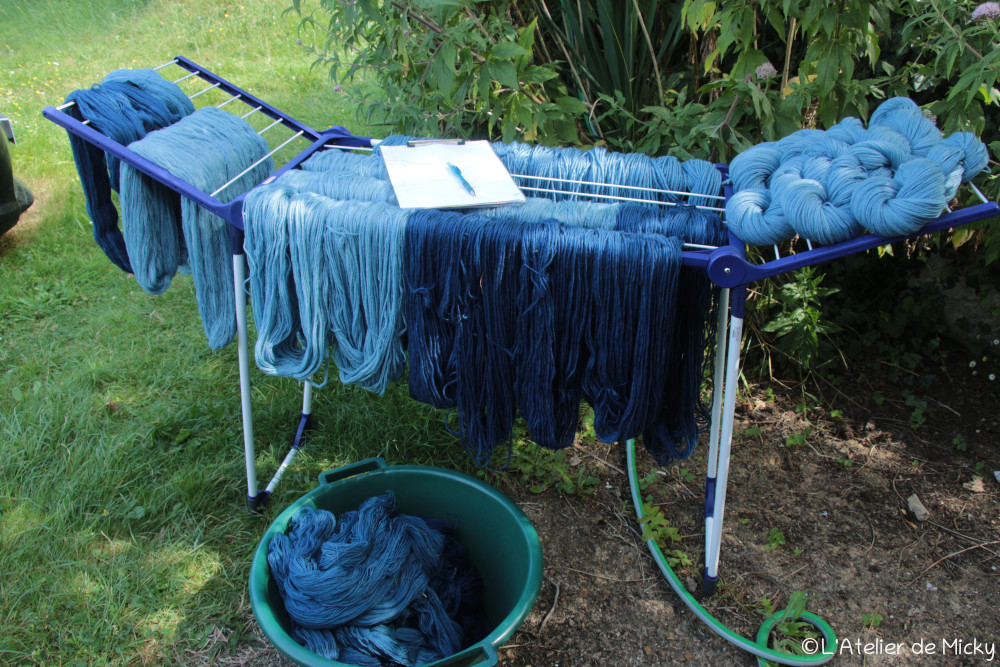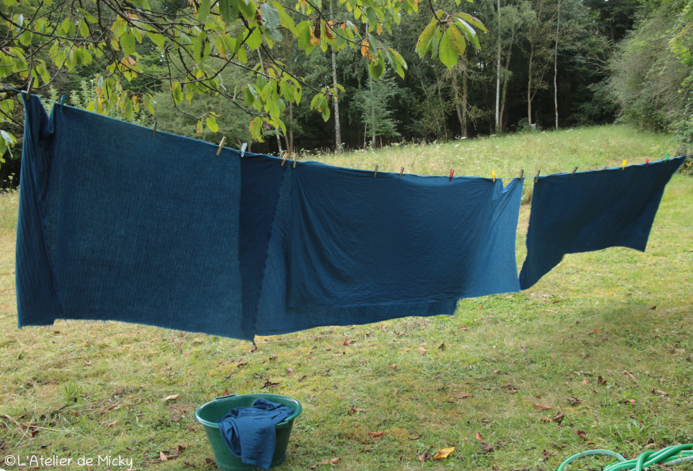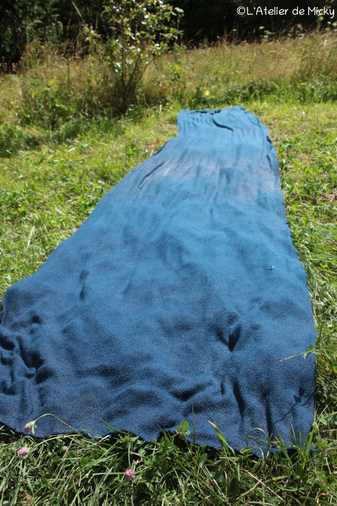 J’ai teinté des petites pièces de tissu en bleu également, pour ma prochaine animation: une semaine de teintures en pièces au musée Arkéos de Douai comme l’année dernière. Une partie restera bleue, l’autre sera teintée en vert avec de la gaude. J’ai préféré teinter le bleu chez moi car c’est toujours compliqué de faire de bons rinçages juste avec tuyau d’arrosage et sans mon matériel chez moi. Il aurait également fallu exprès le chaudron à bleu, avec toute la logistique que ça demande.