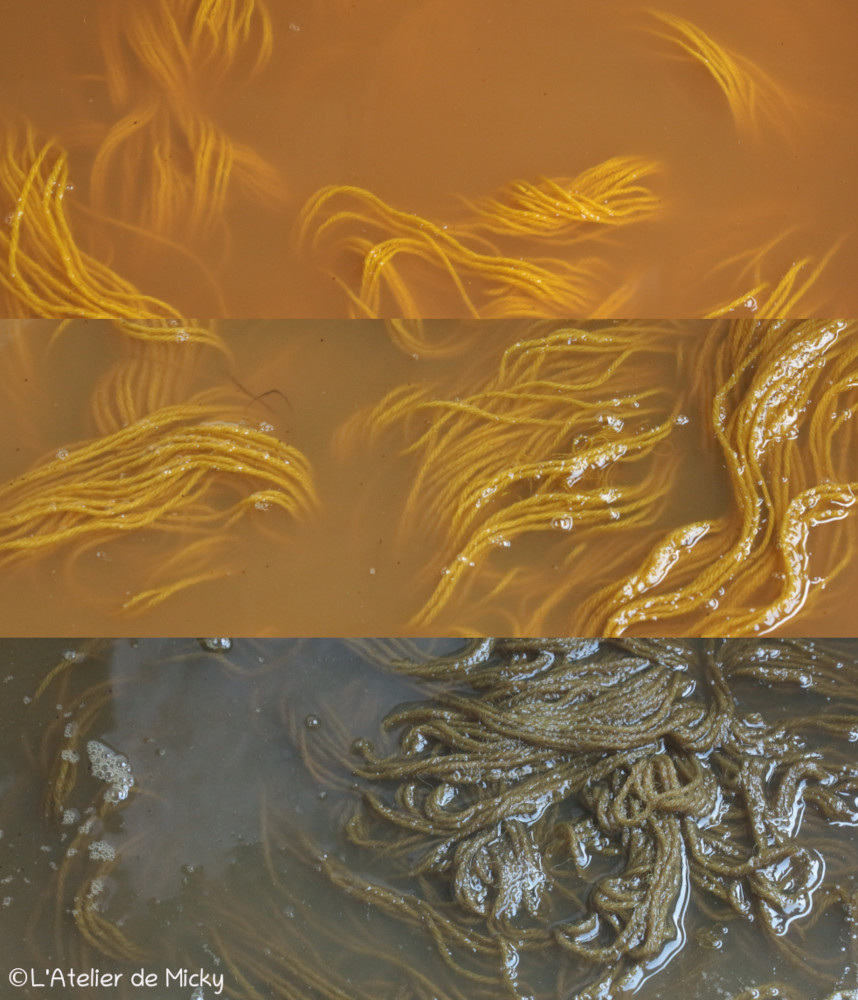 Pour que le fer fasse son effet, c’est comme avec la cochenille, il faut monter en température! Voilà une triple image montrant la couleur gaude dans le bain de nuançage vers 40°, 60° puis au-dessus de 80°C.