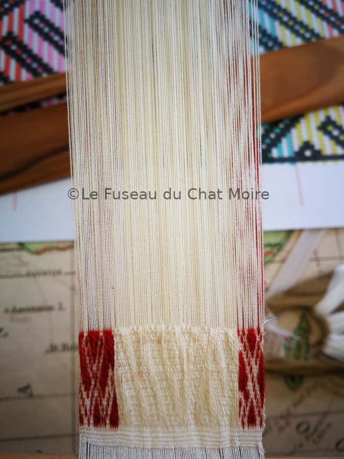 Voici ma voisine de droite pendant cette semaine: le Fuseau du Chat Moire, qui avait comme objectif de reproduire un galon en soie conservé au musée et plutôt inhabituel, comportant une couche de ce qui semble être de la peinture. Elle avait préparé une chaîne avec des lisses vraiment impressionnante que j’ai complètement oublié de prendre en photo. Une photo du tissage en cours est dans la galerie.