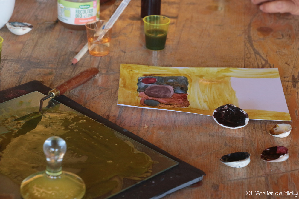 La laque en cours de précipitation pendant l’atelier (merci Antoine pour la photo!)