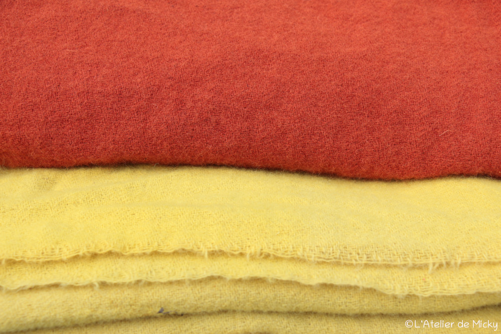 Si le rouge garance est encore à peu près acceptable, les jaunes sont vraiment moches! Et ce tissu ressemble à de la serviette éponge.Ne pas vouloir faire d’économies sur les tissus à teinter… jamais!