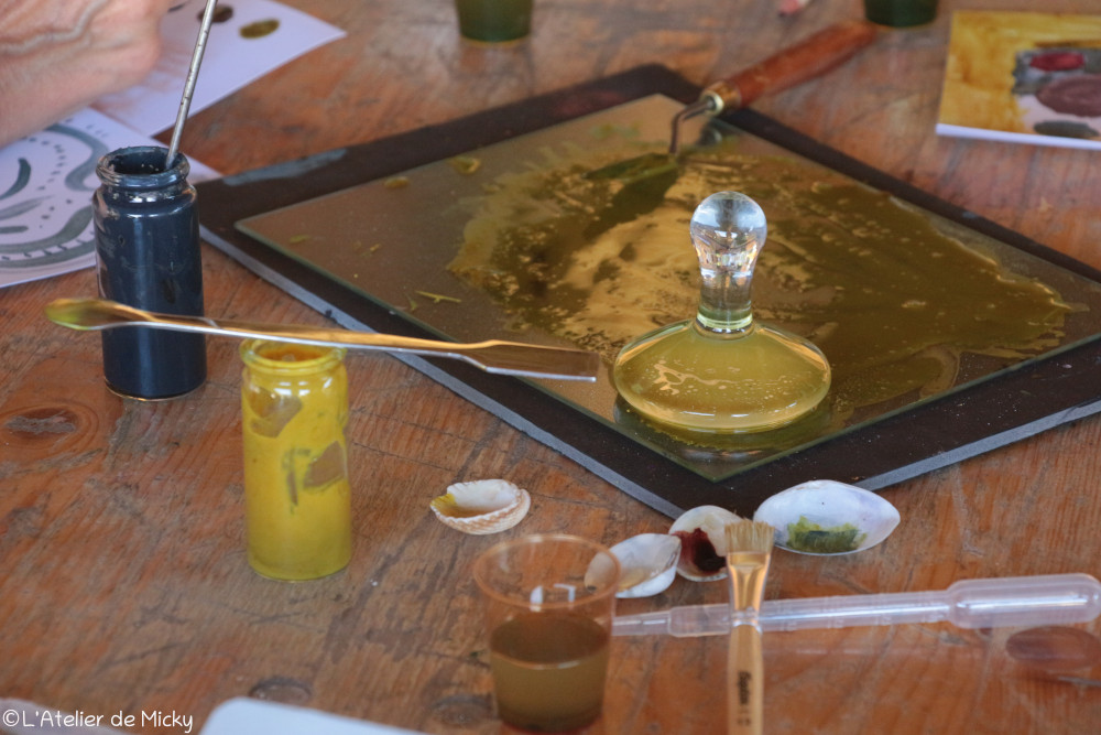 La laque en cours de précipitation pendant l’atelier (merci Antoine pour la photo!)
