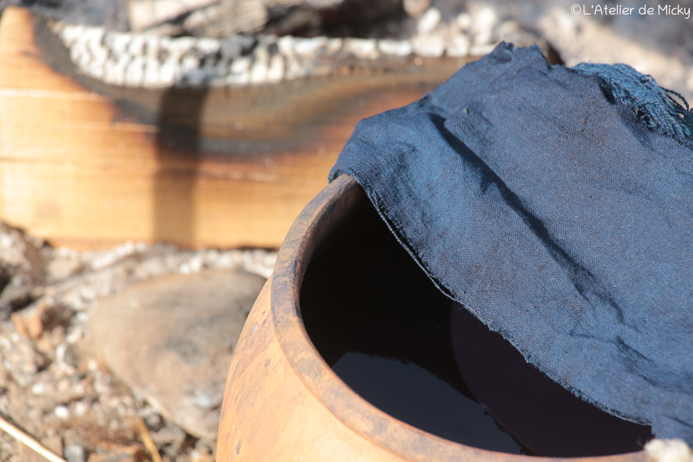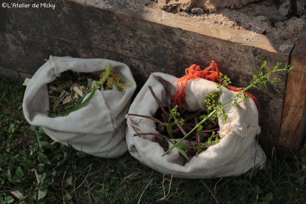 L’année dernière, j’avais teinté plein d’écheveaux pour le musée, cette fois je devais teinter des coupons de tissus. Mais tout ne s’est pas passé comme prévu, j’ai accumulé les ennuis… J’avais prévu quelques tissus qu’on m’a cédé et qui avaient été apparemment mordancés, mais je n’avais pas d’indications à ce sujet. Suite à un test chez moi pendant lequel la couleur n’était pas bien montée, j’avais décidé de les re-mordancer sur place, mais au final, les résultats ont été une catastrophe!