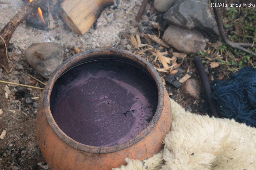Bon, ce n’est pas un drame, je re-teinterai de jolis tissus pour le musée. Si mon égo et ma conscience professionnelle en prennent un coup lorsqu’il y a des ratés en démonstration, l’illusion d’une jolie couleur est présente tant que je ne les sors pas du bain de teinture! C’est fou comme un tissu mouillé peut avoir l’air chouette dans la teinture et se transformer en monstre dès qu’on l’essore… Ce qui est rageant, ce que j’ai gâché de la bonne plante tinctoriale pour pas grand chose, mais ce sont des choses qui arrivent.