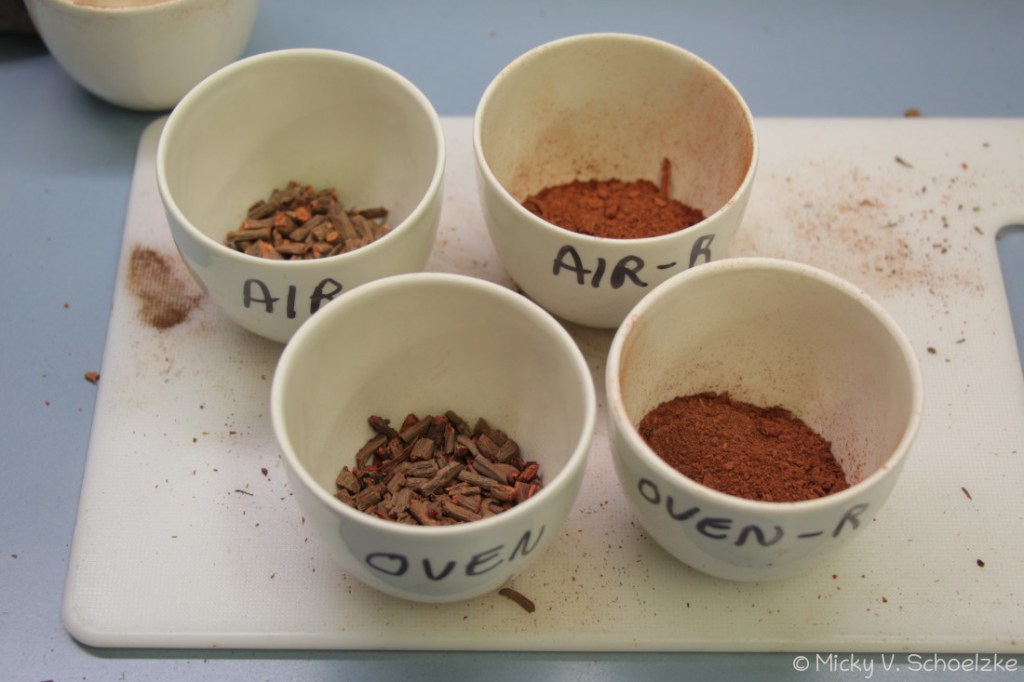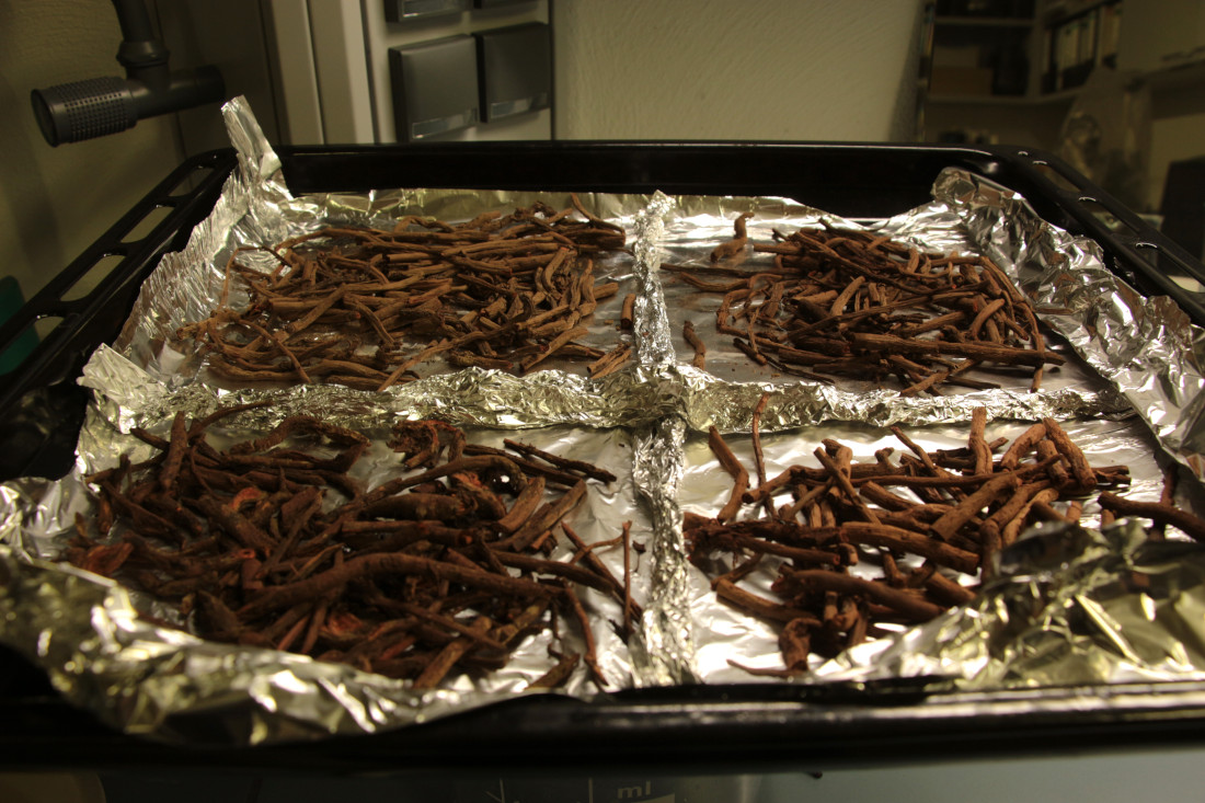 Côté laboratoire, j’ai continué mes expérimentations sur la garance pour mon projet « fausse pourpre » en commençant par faire griller plusieurs échantillons au four.