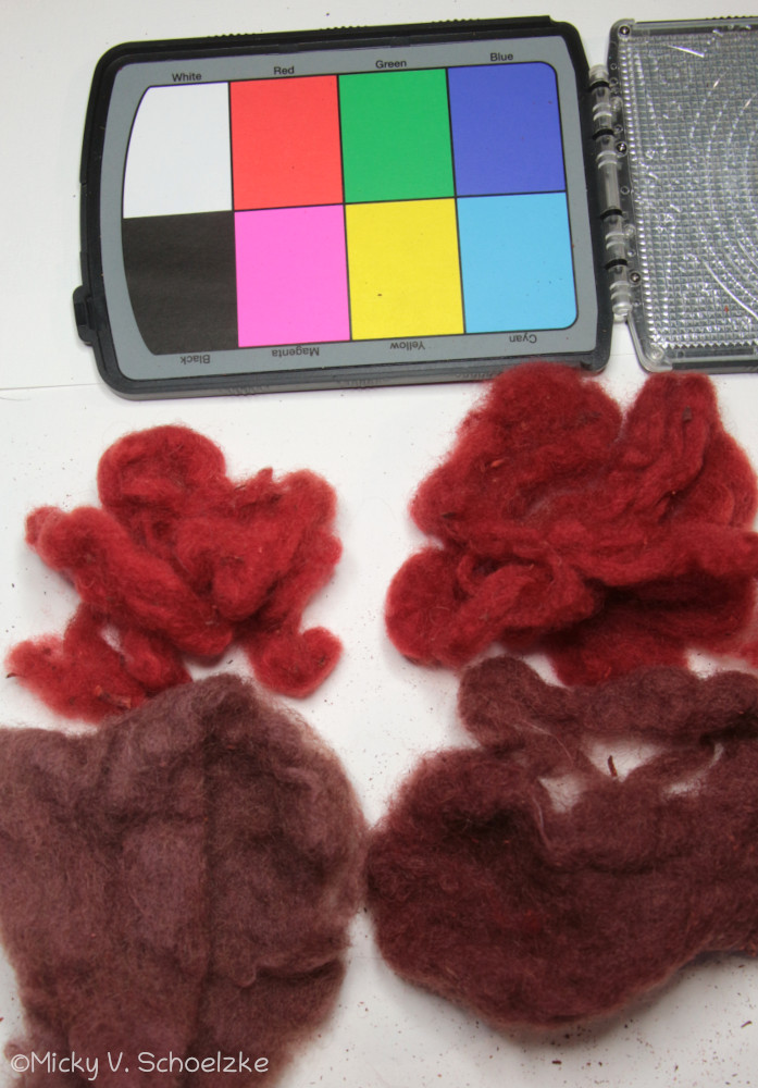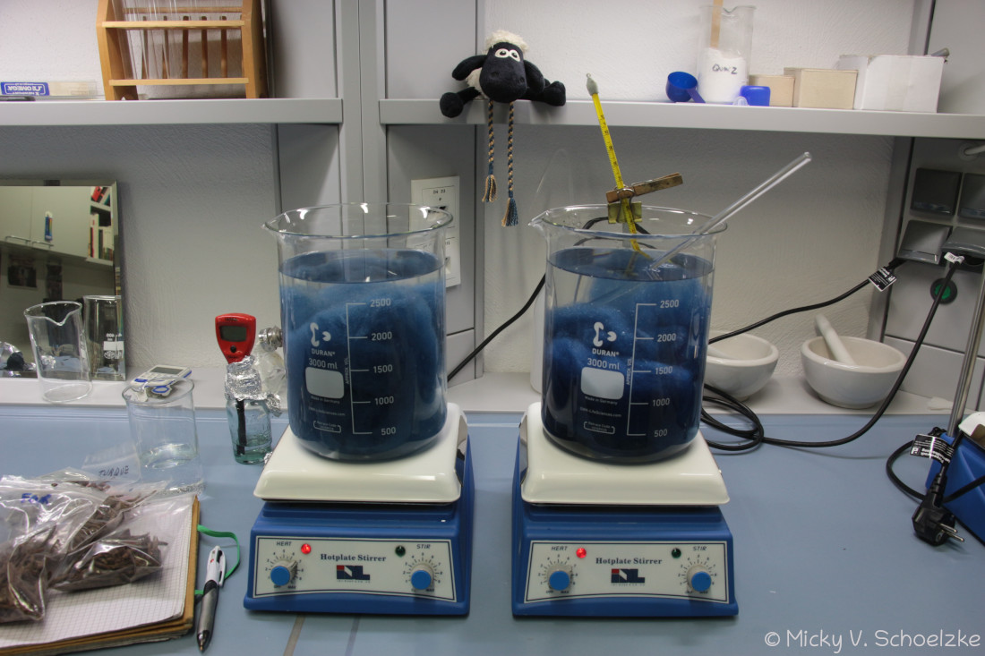 But for the first time I was able to carry out a test using the entire Papyrus recipe (dyeing blue wool with roasted madder, rinsing in salt water, adding bean flour etc.). The result is on the left (on the right it’s a ‘normal’ over-dye under the same conditions but without the extras). I can’t say anything for sure at the moment.