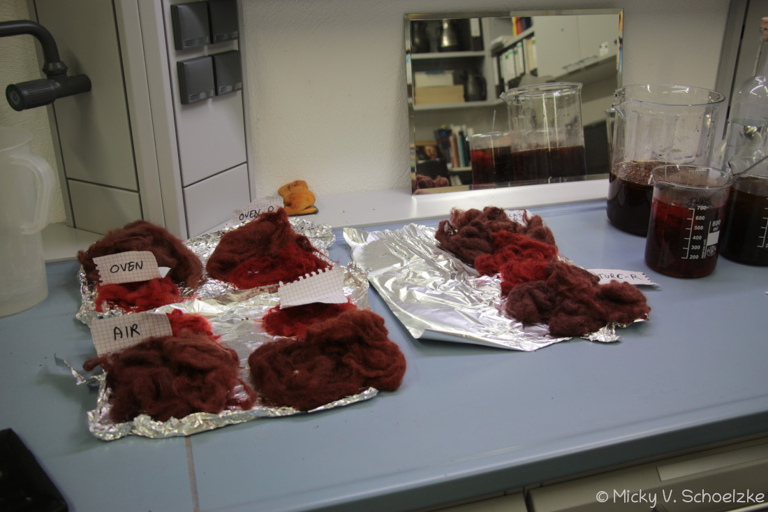 There are several dyeing results that didn’t quite turn out as I expected, which is a result in itself! I have to say that several times I felt like changing quite a few things in the process… My ‘instinct’ as a dyer sometimes has a hard time coping with the scientific protocols that have to be followed. Once you’ve decided on an experimental protocol, you can’t change everything along the way, otherwise you end up with samples that you obviously can’t compare.